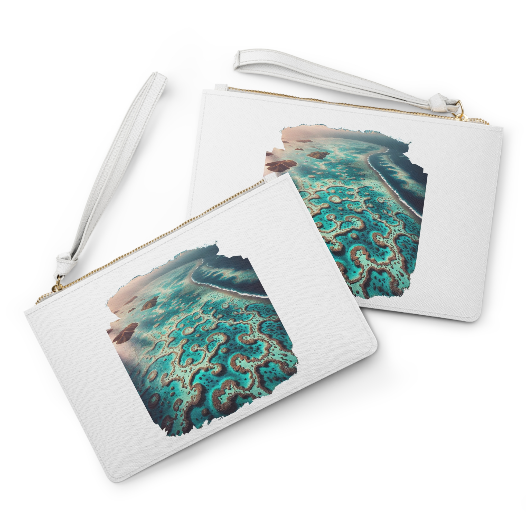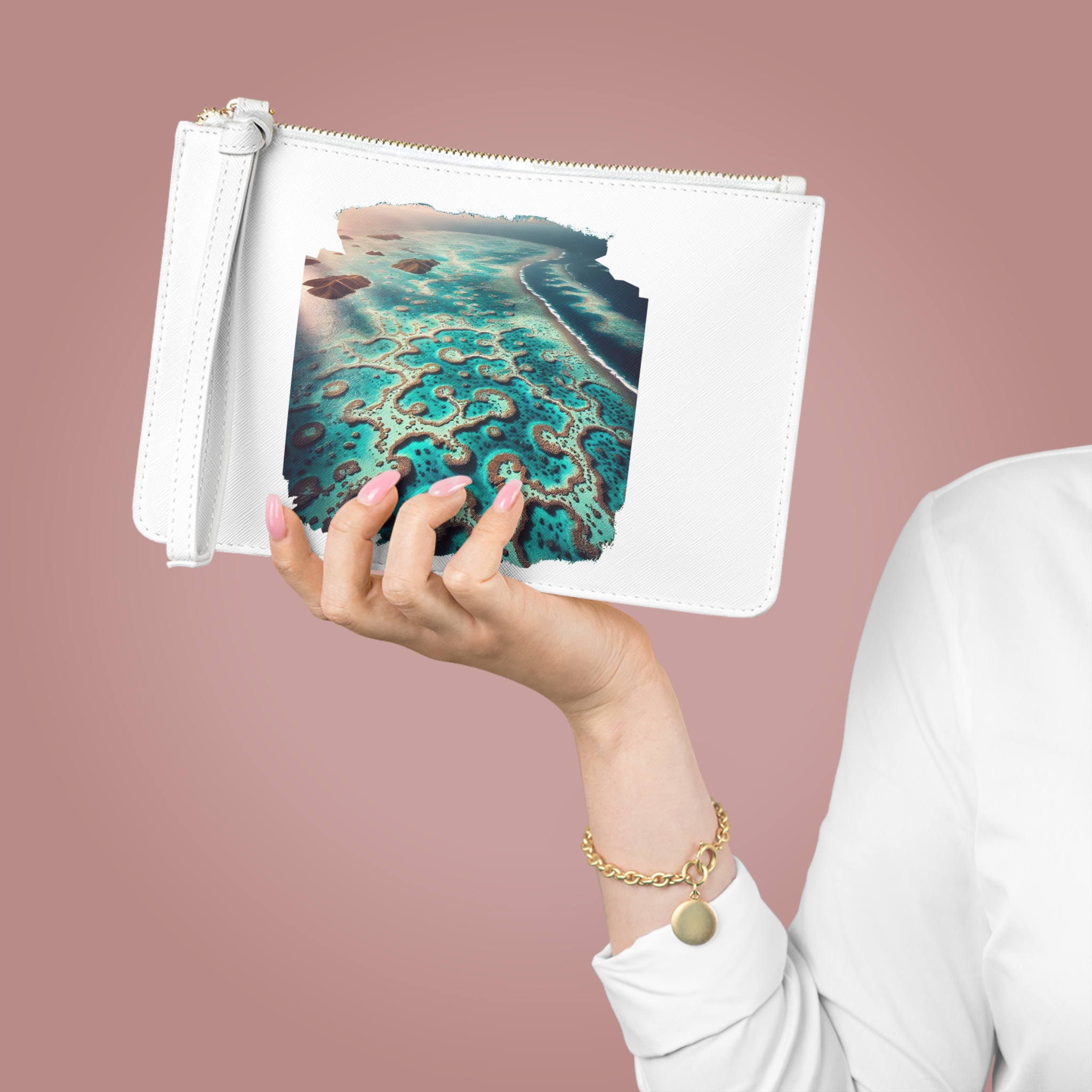 Influences from coral reef clutch and nature print purse give it a calm and thoughtful visual identity.