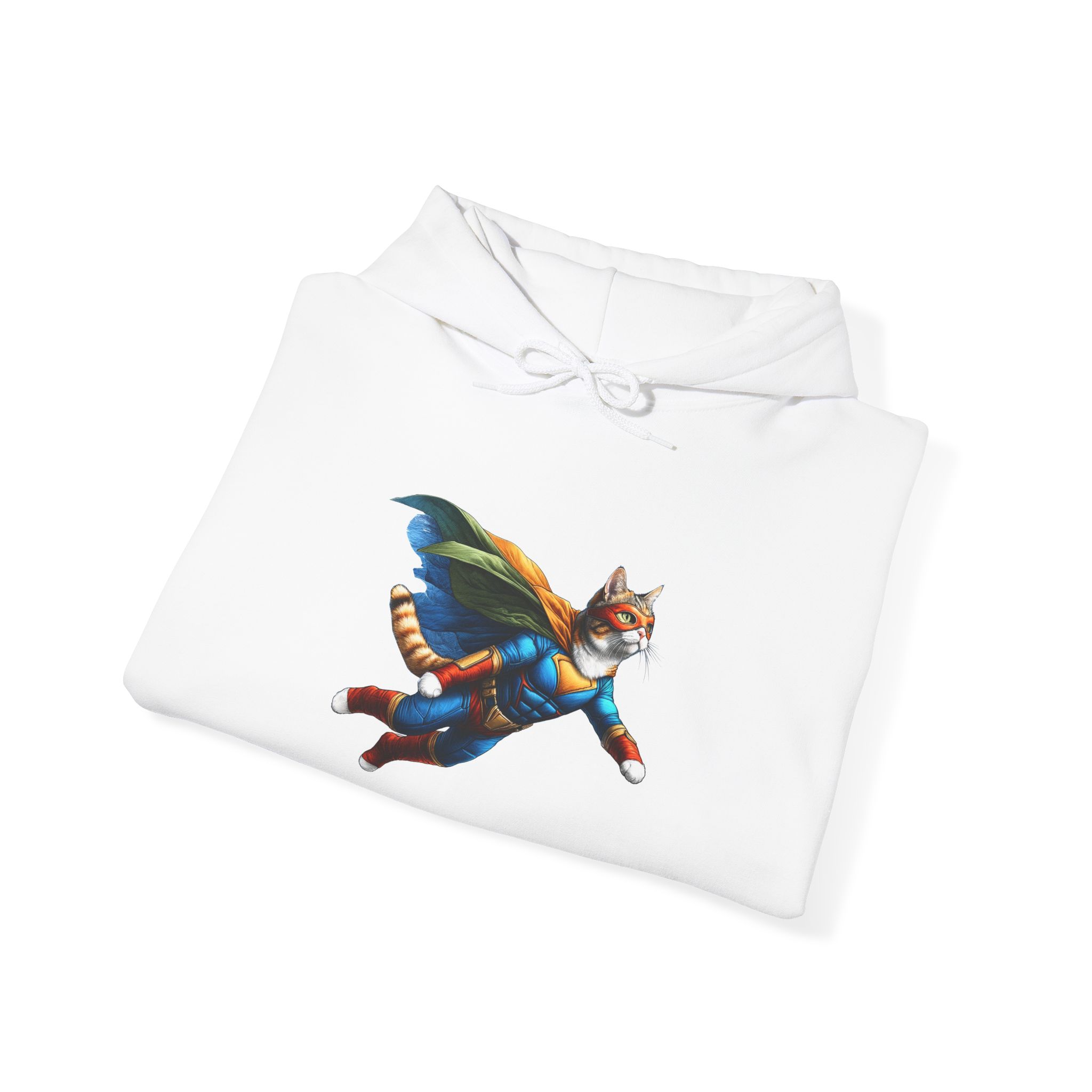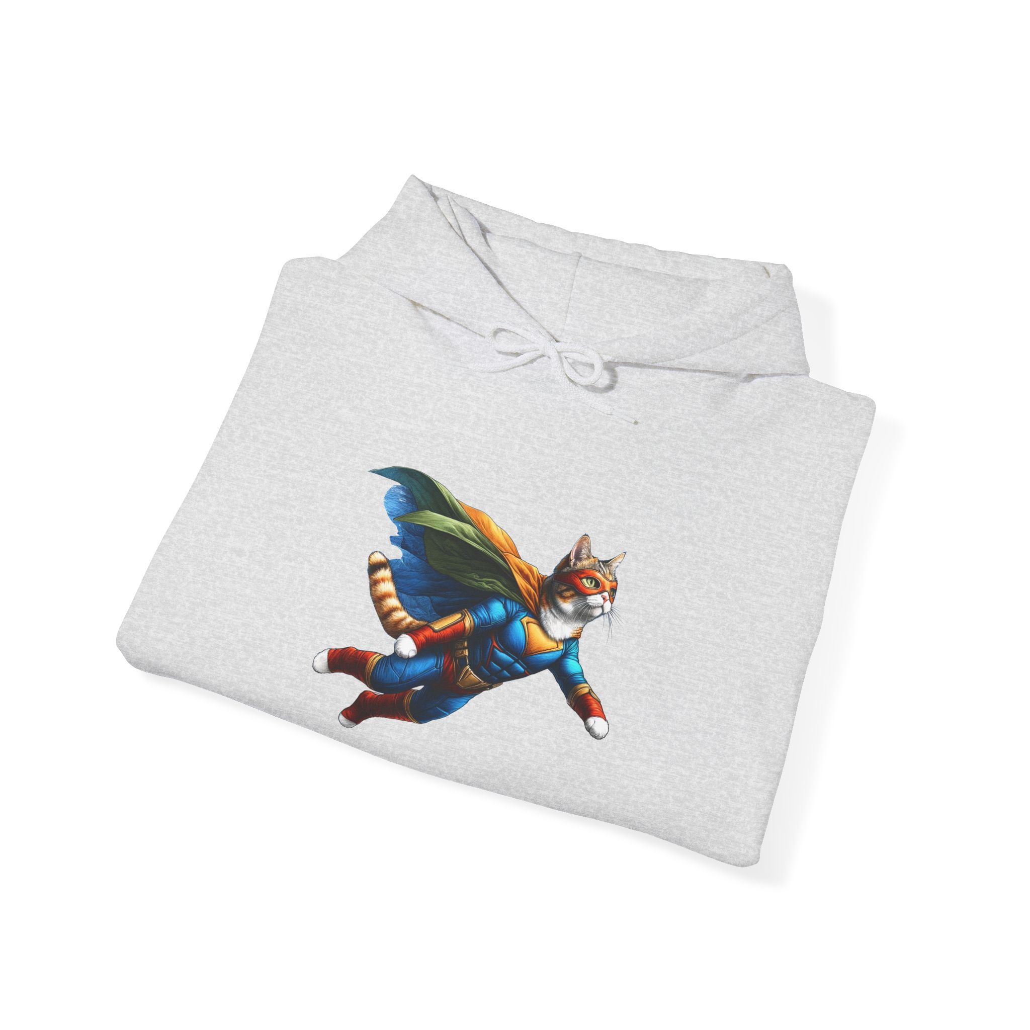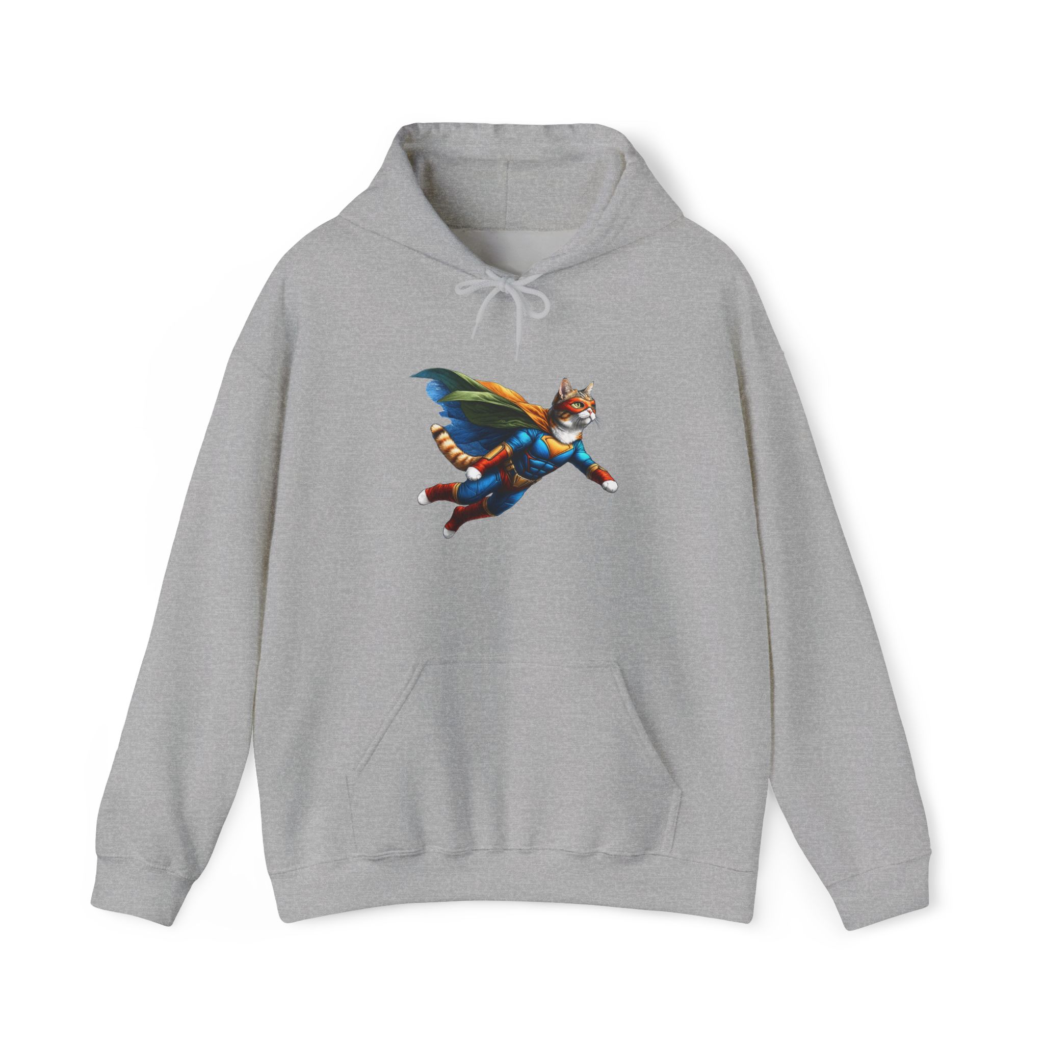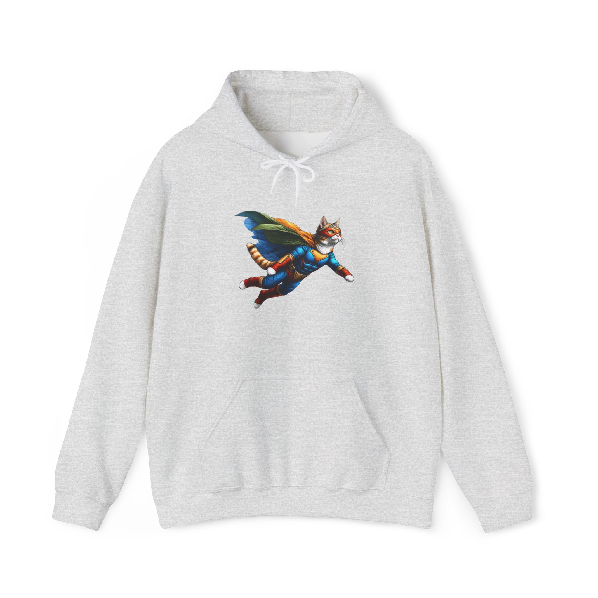 This funny cat hoodie, a mix of fantasy sweatshirt and cat hero humor, features cat super hero art in an oversized hoodie made for cat lovers.