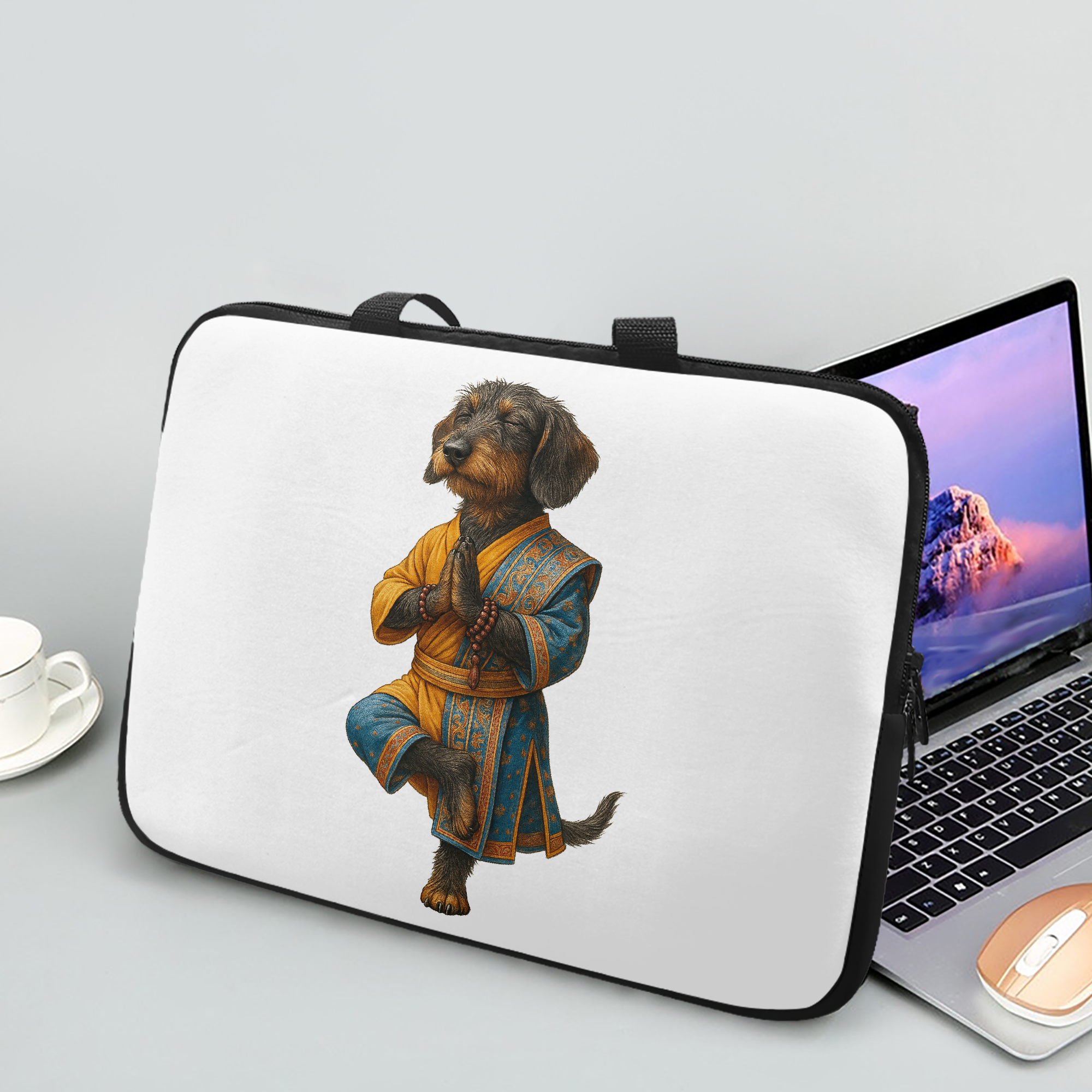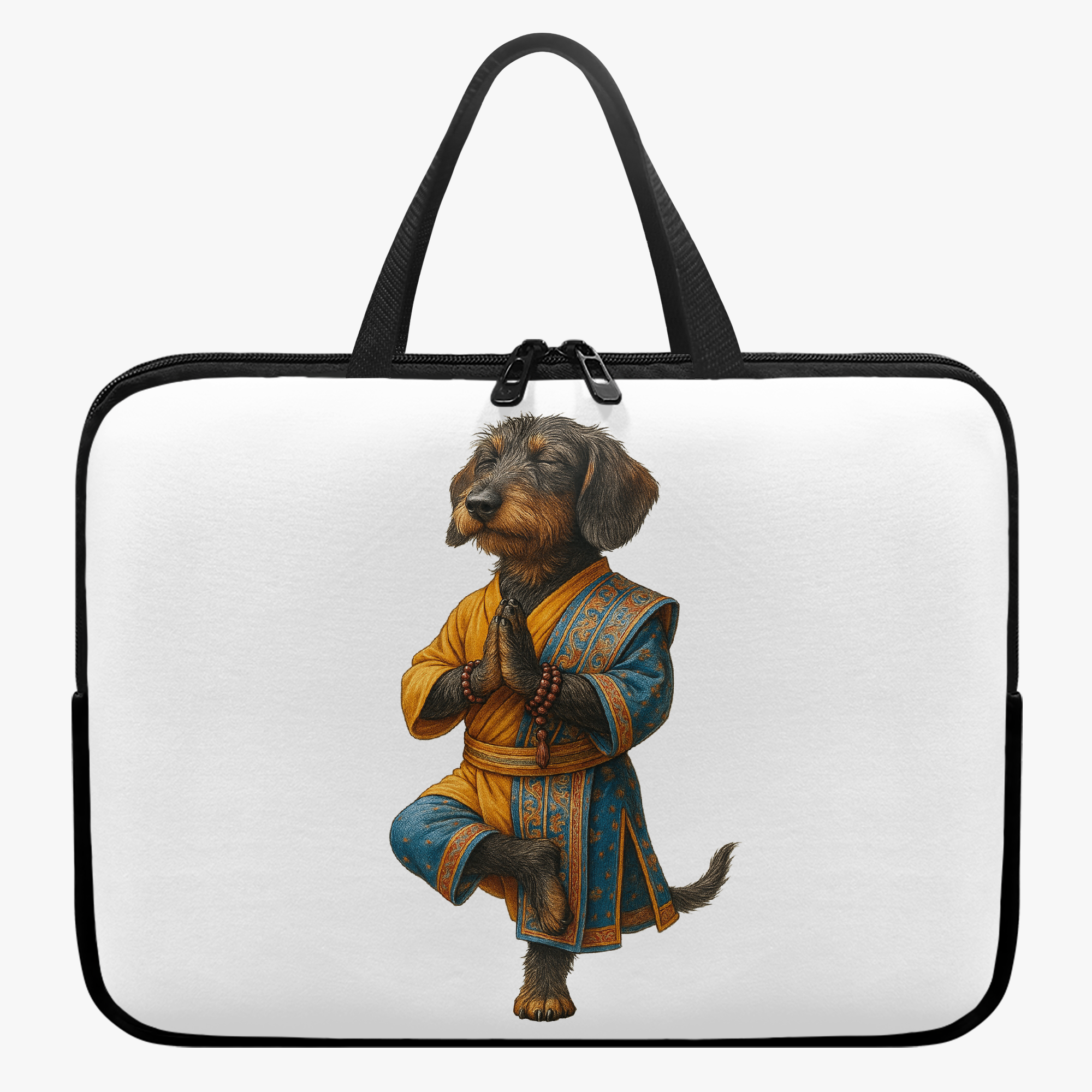The dog yoga laptop sleeve and macbook sleeve highlight buddha clothes inspiration, cool dog print art, and mindfulness design.
