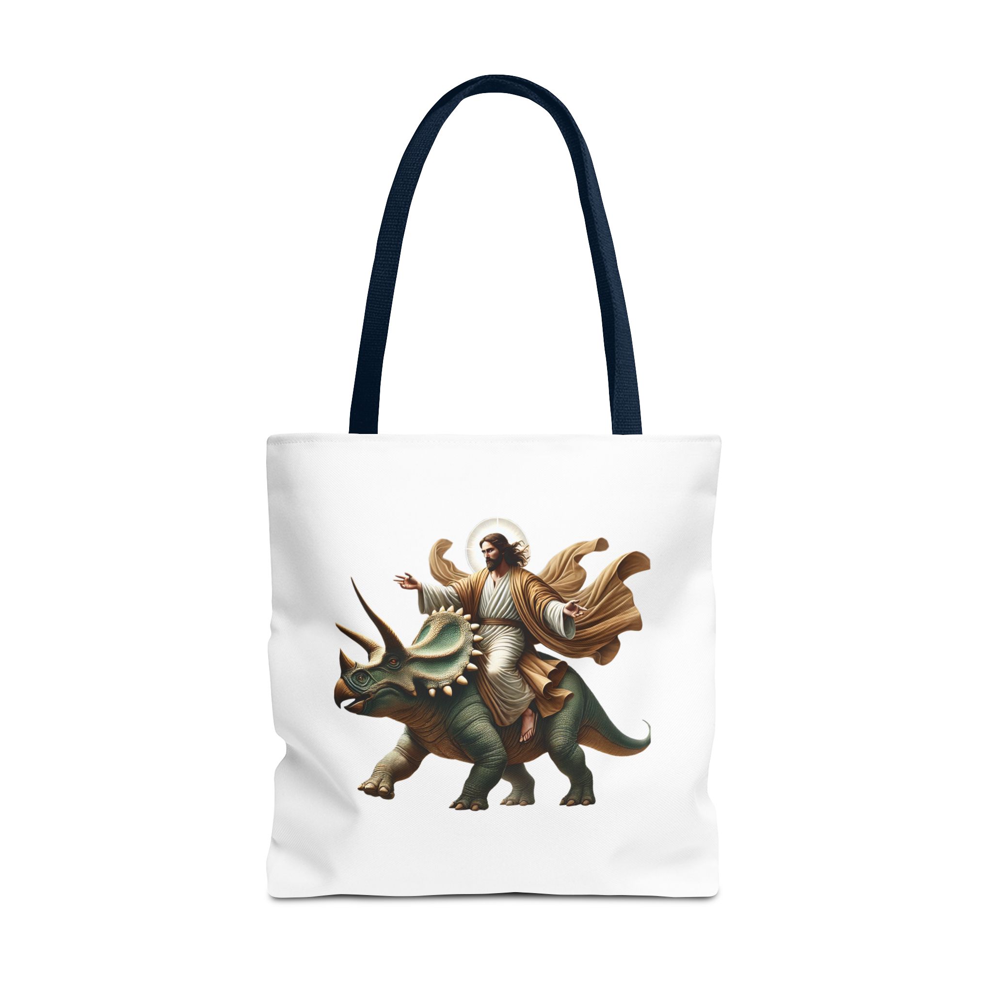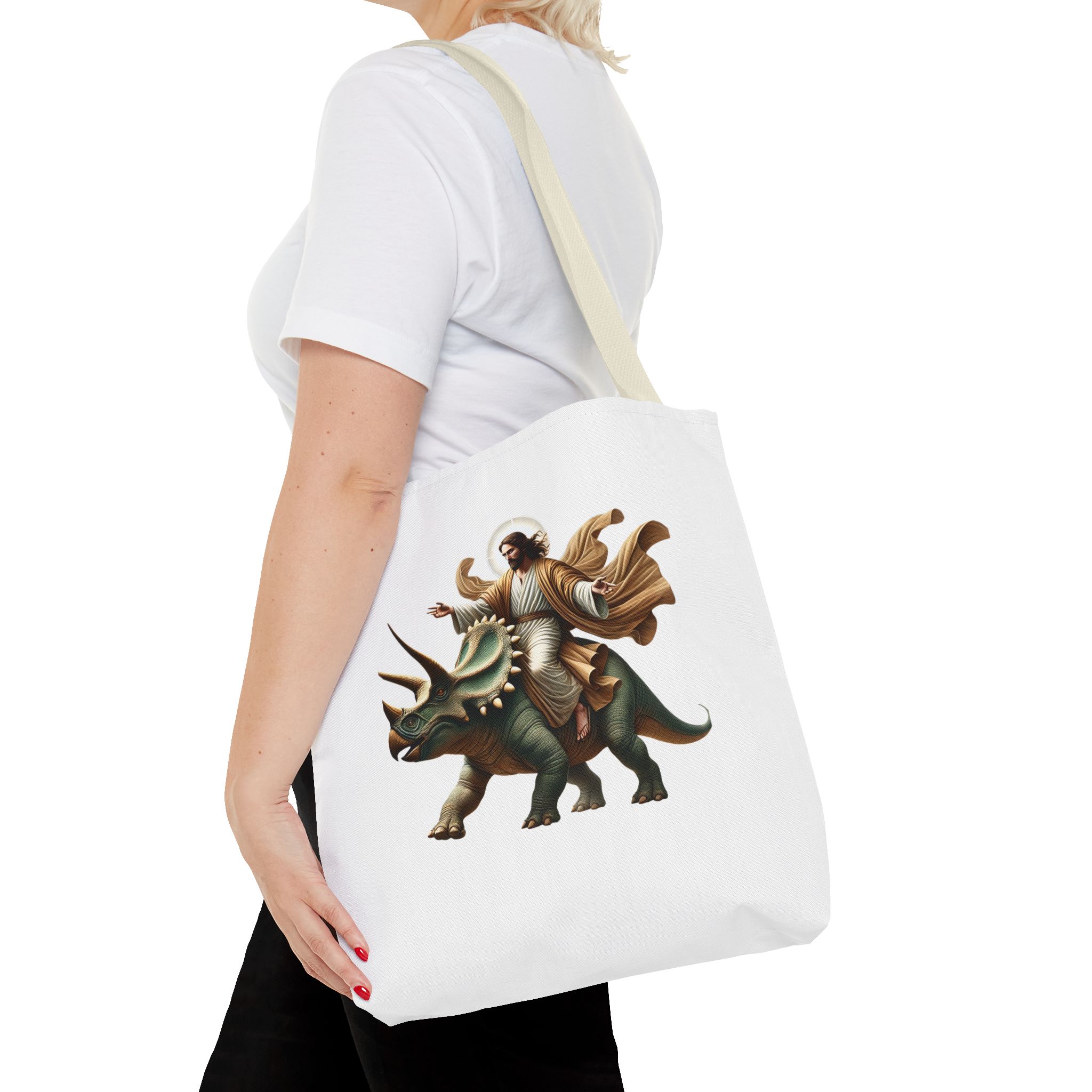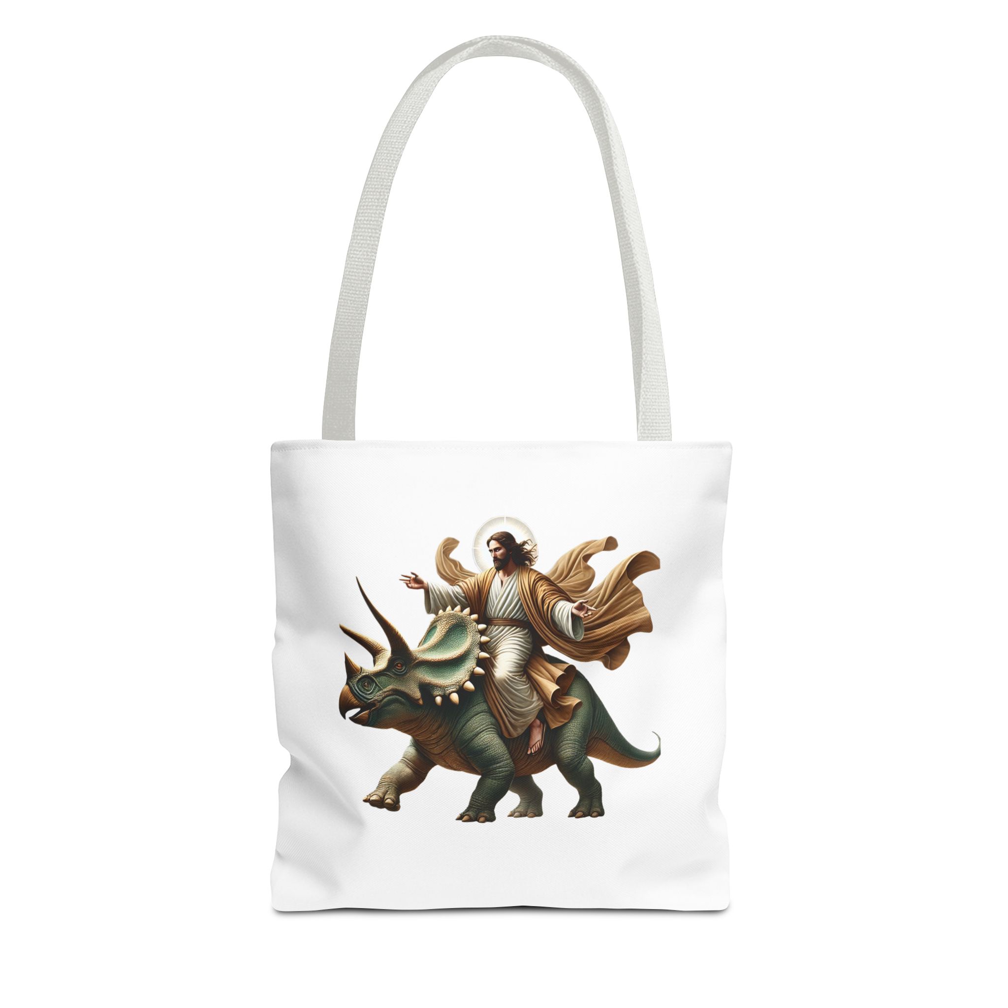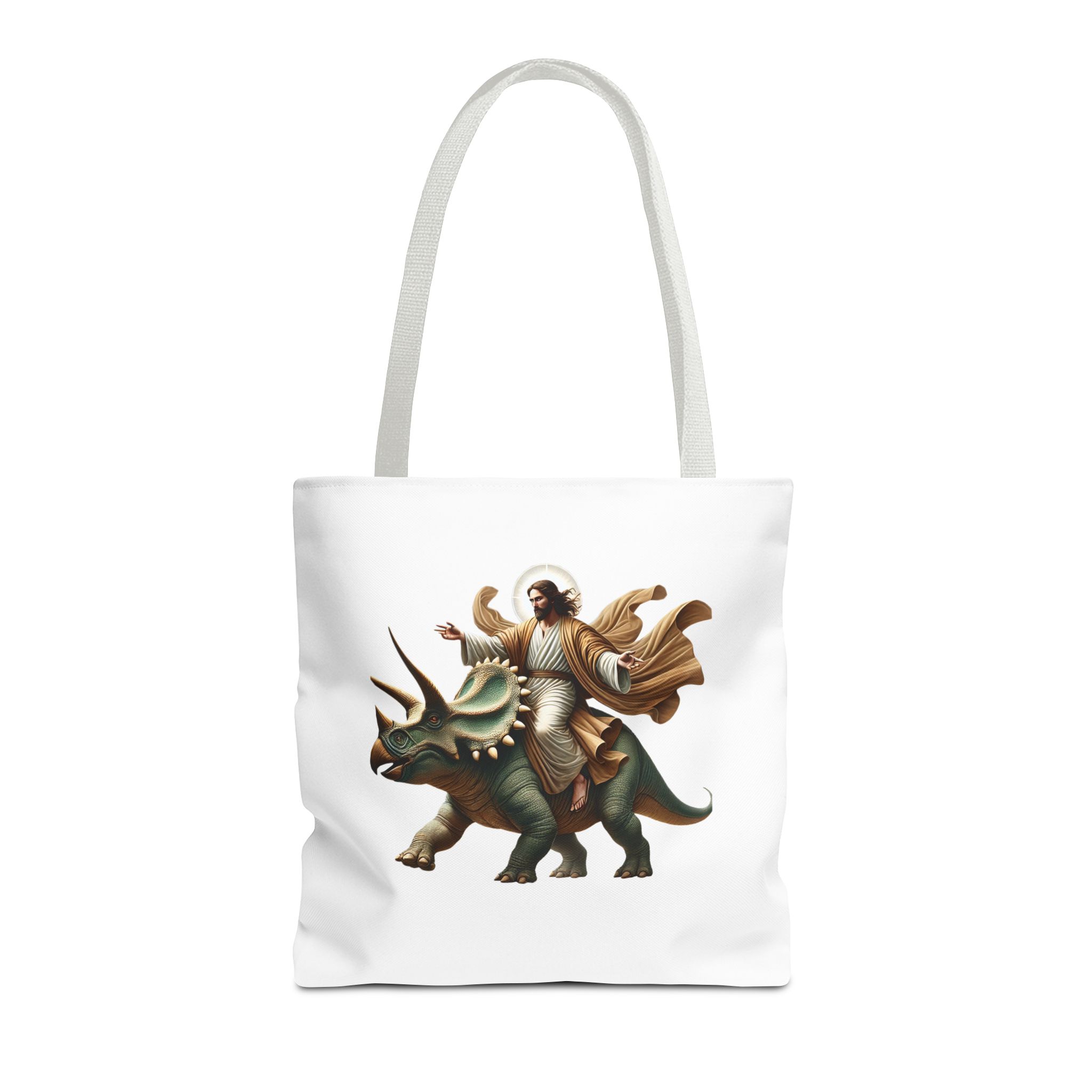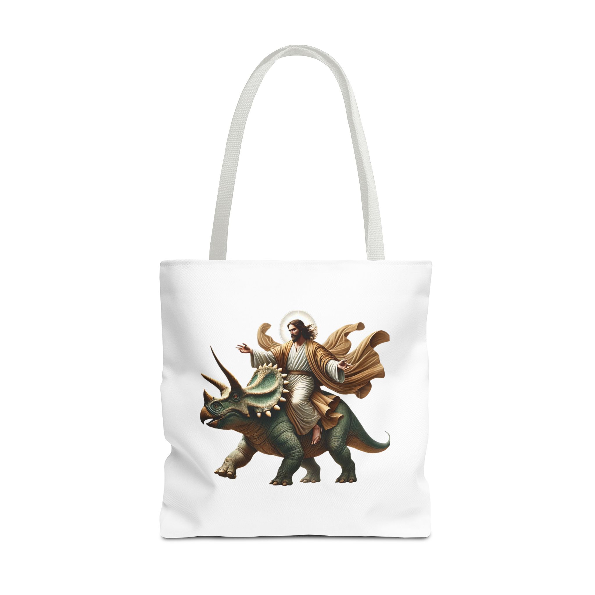 Fun canvas tote bag jurassic boho tote bag Jesus riding triceratops shoulder bag satiric purse religious design sarcastic cute tote bag