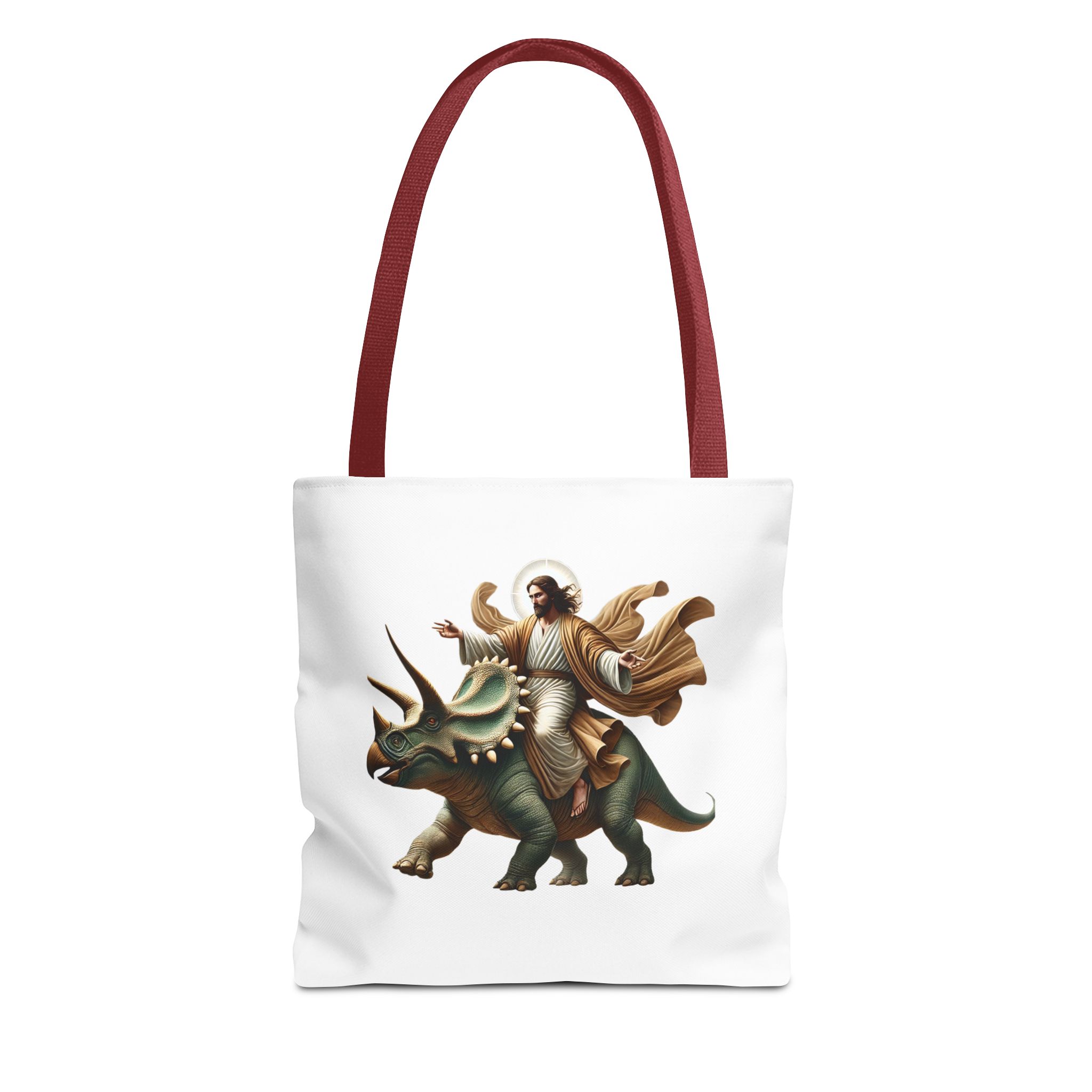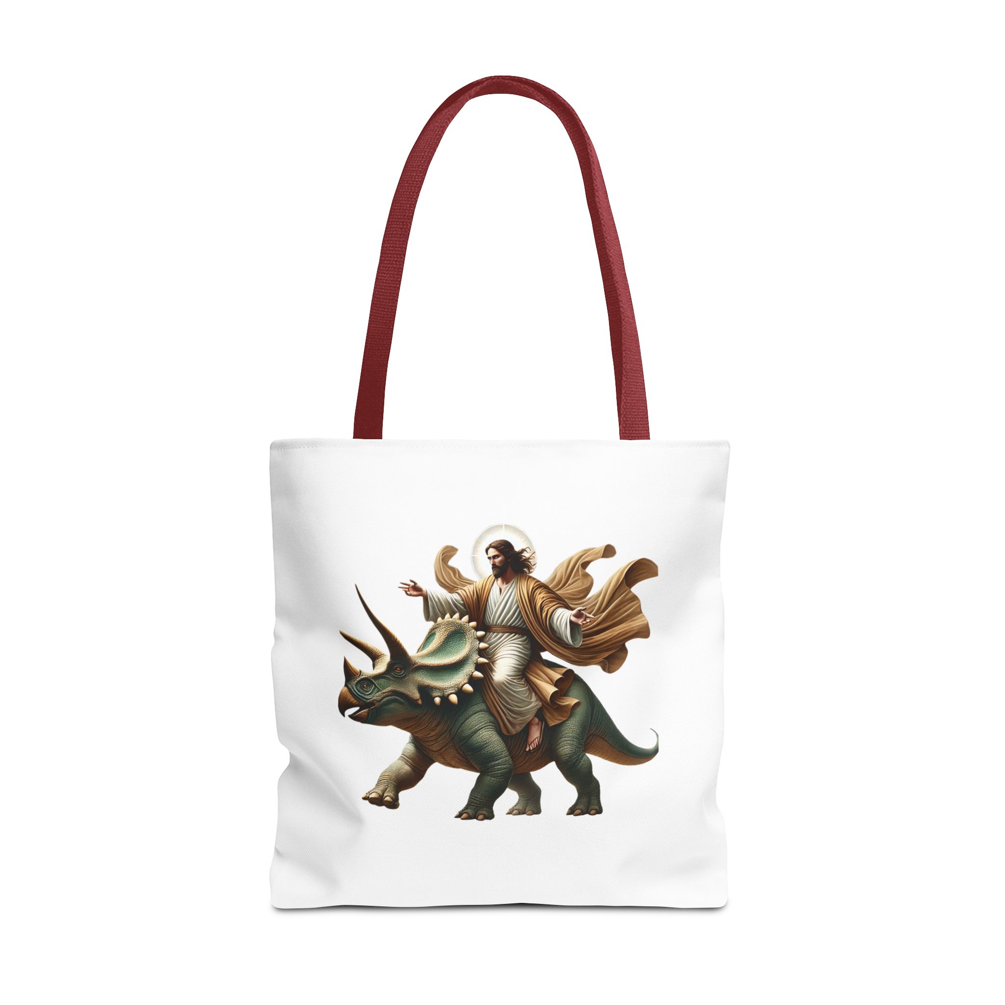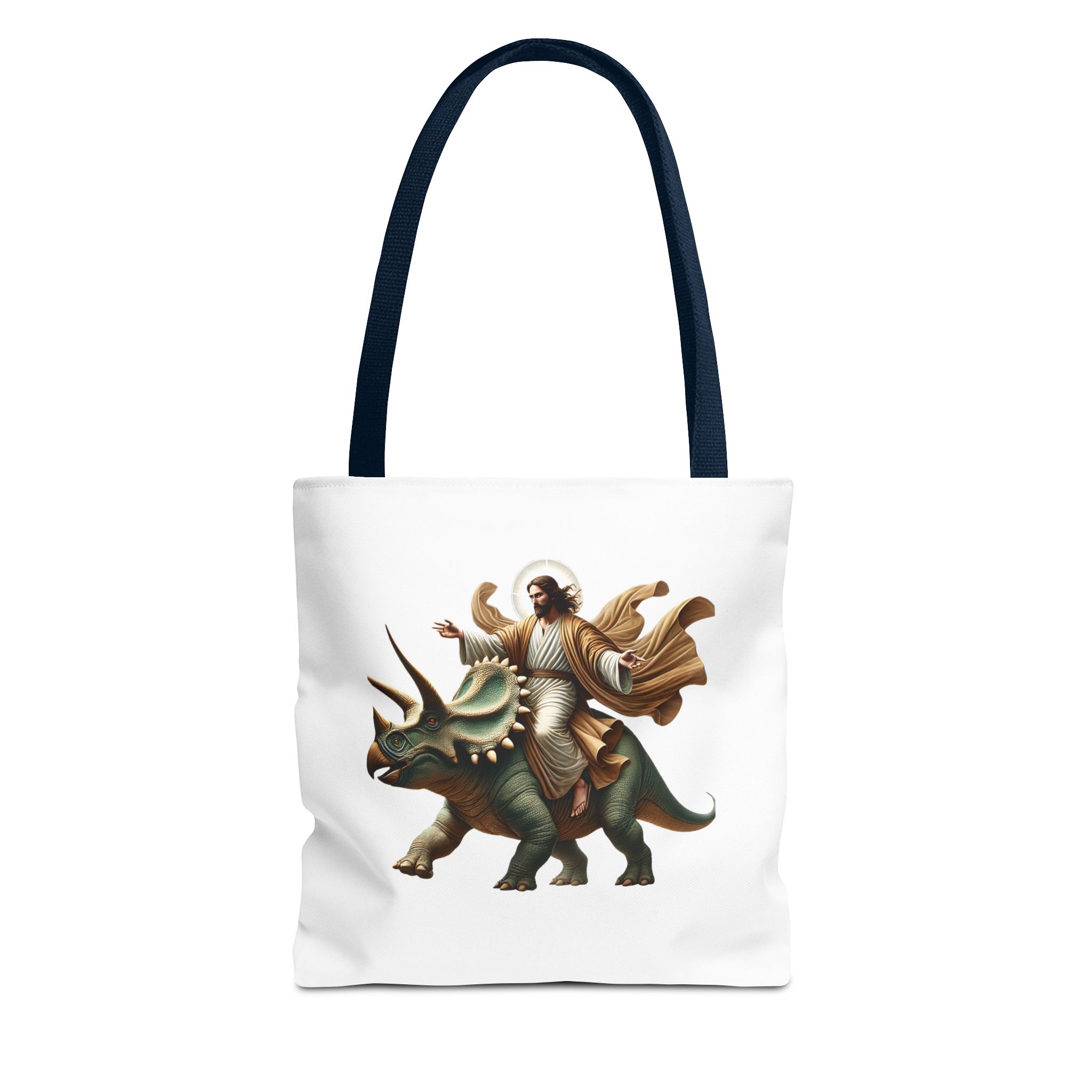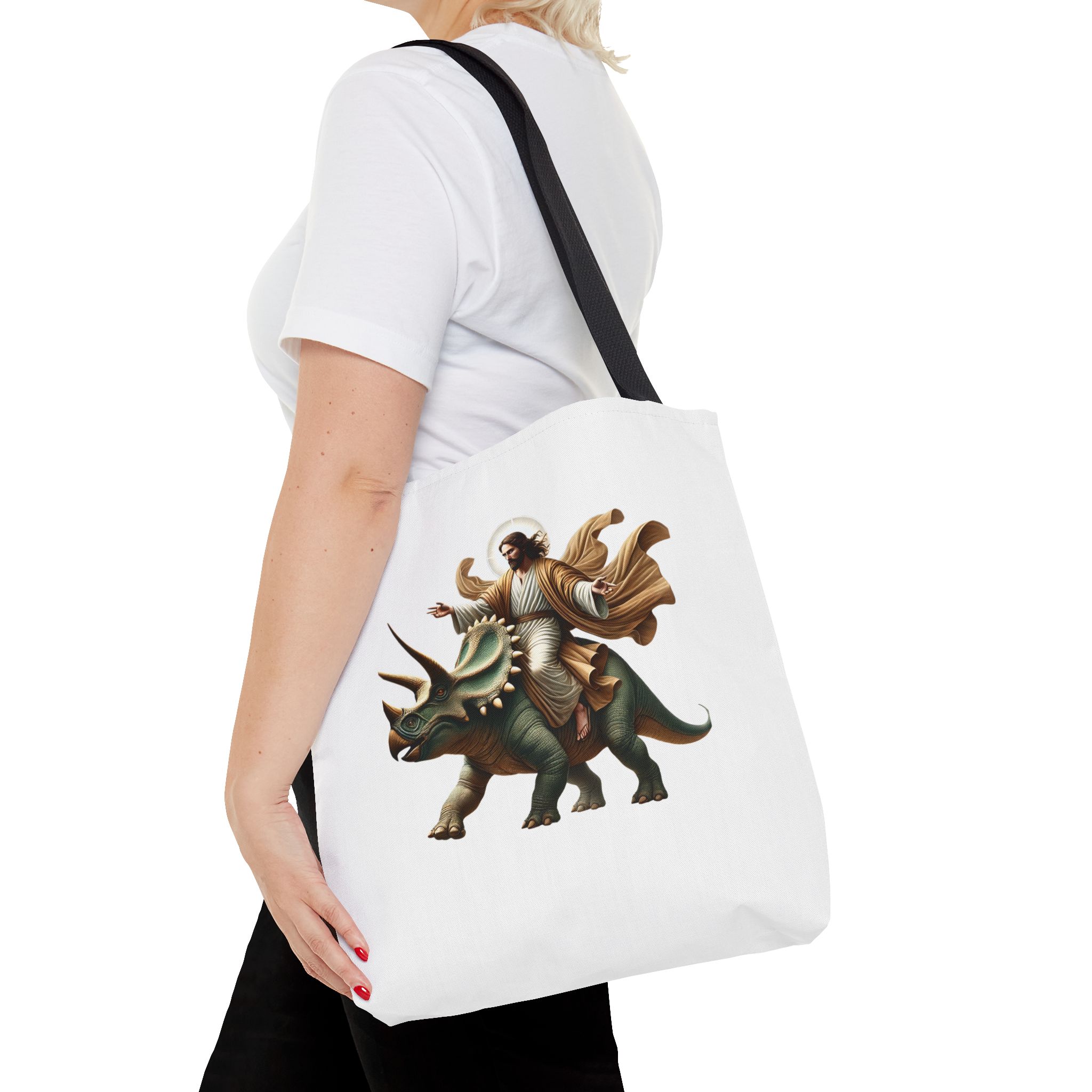 Fun canvas tote bag jurassic boho tote bag Jesus riding triceratops shoulder bag satiric purse religious design sarcastic cute tote bag