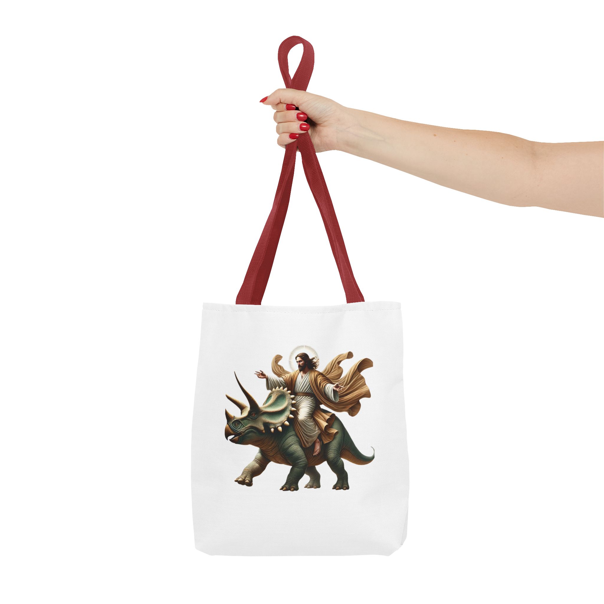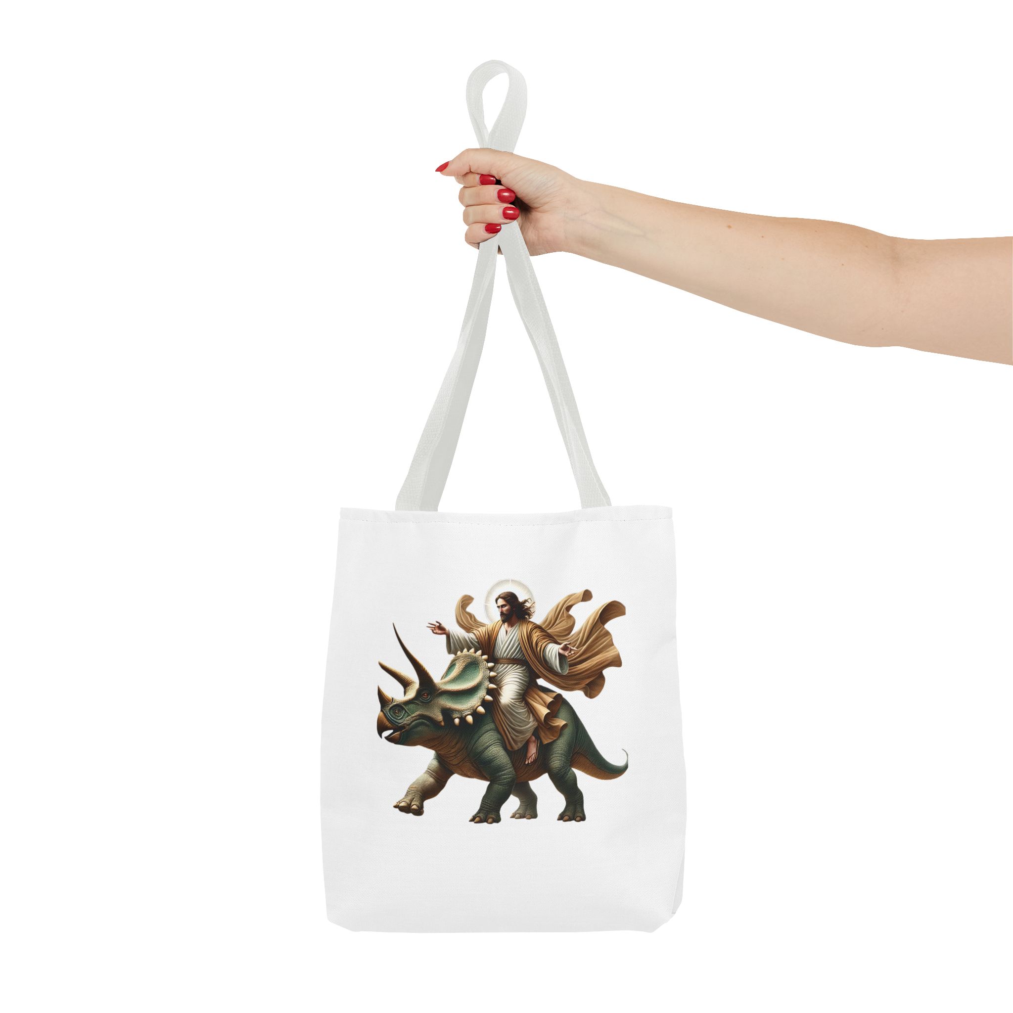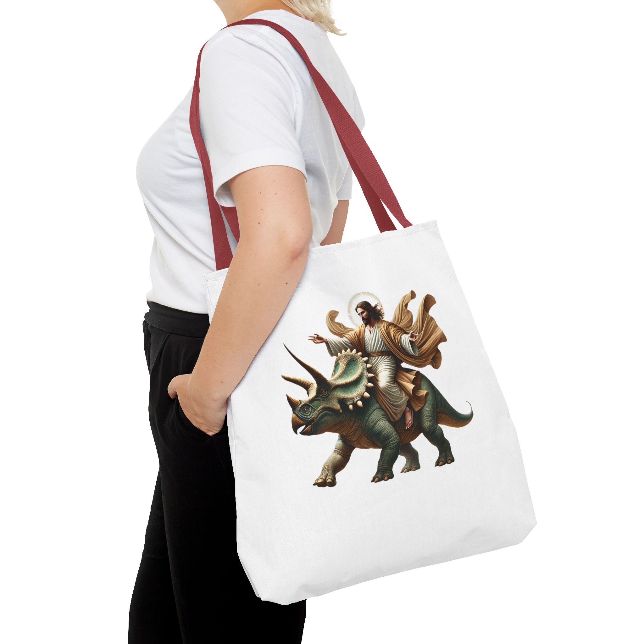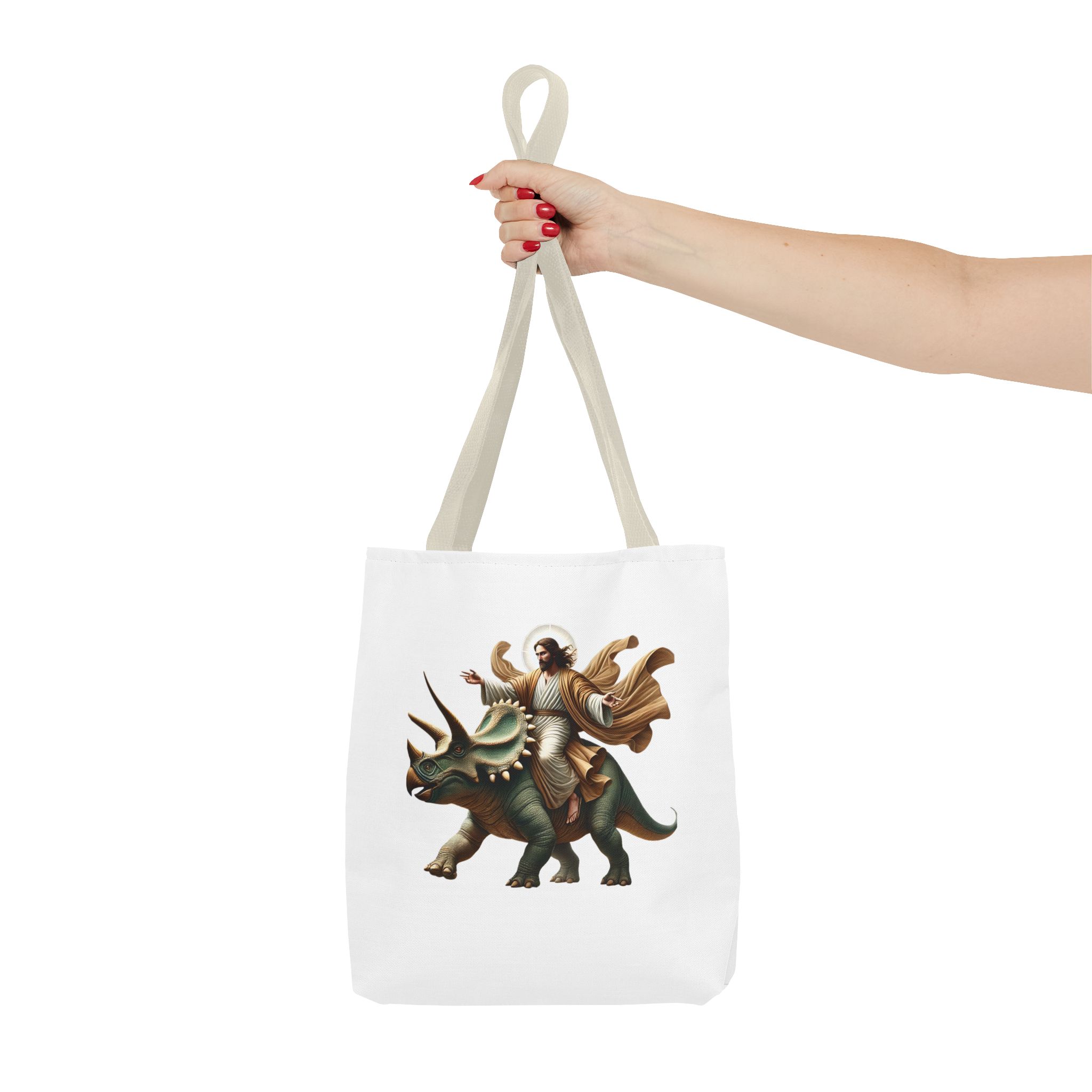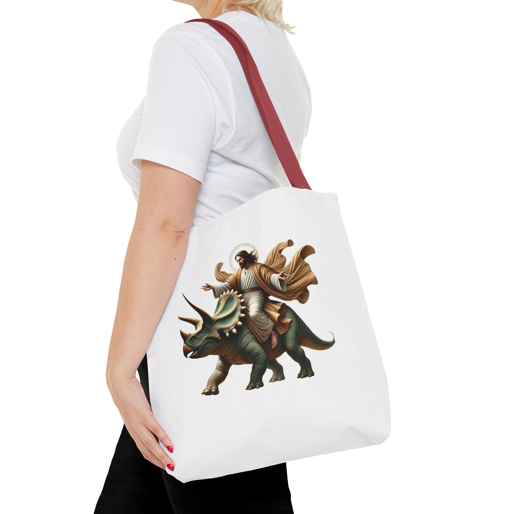 Fun canvas tote bag jurassic boho tote bag Jesus riding triceratops shoulder bag satiric purse religious design sarcastic cute tote bag