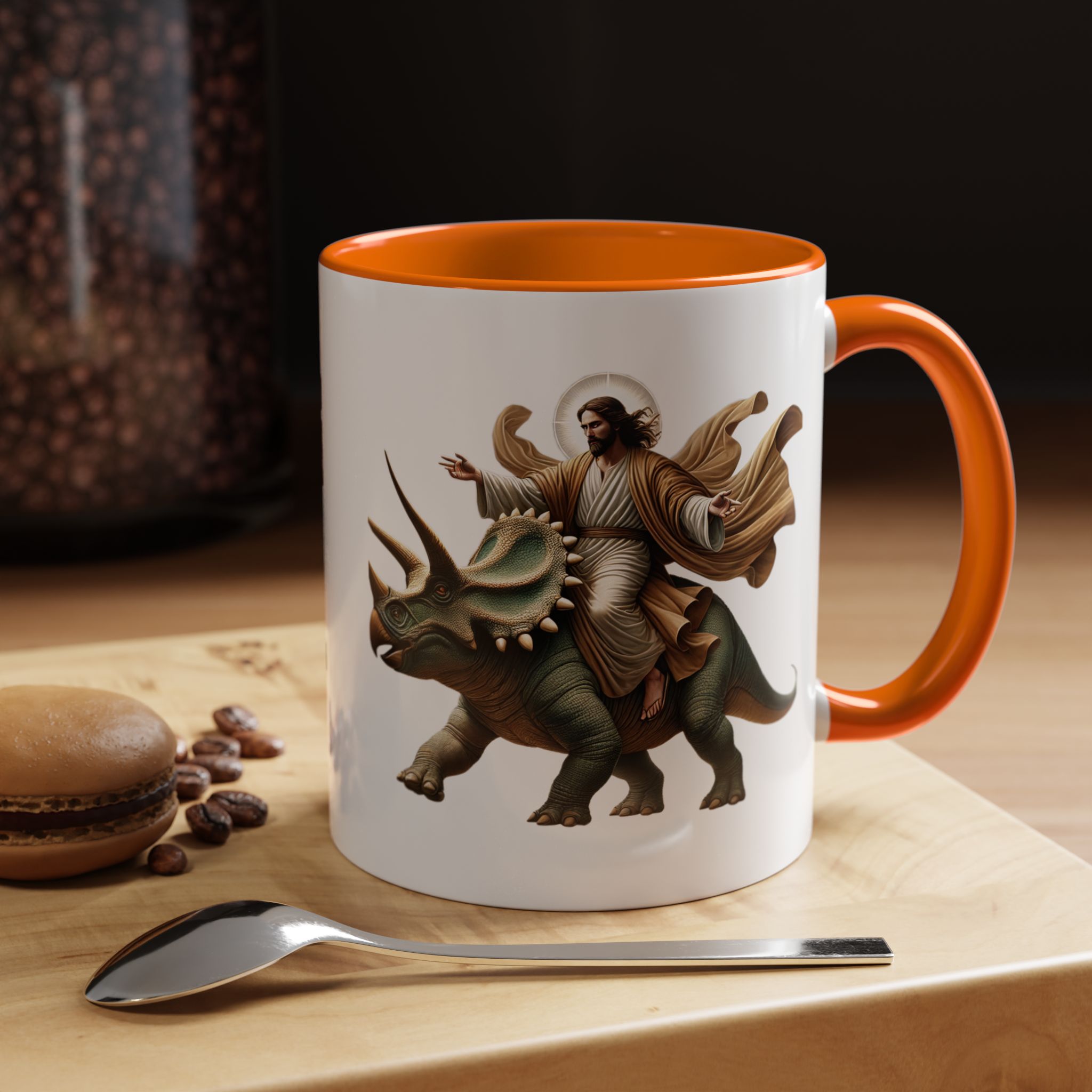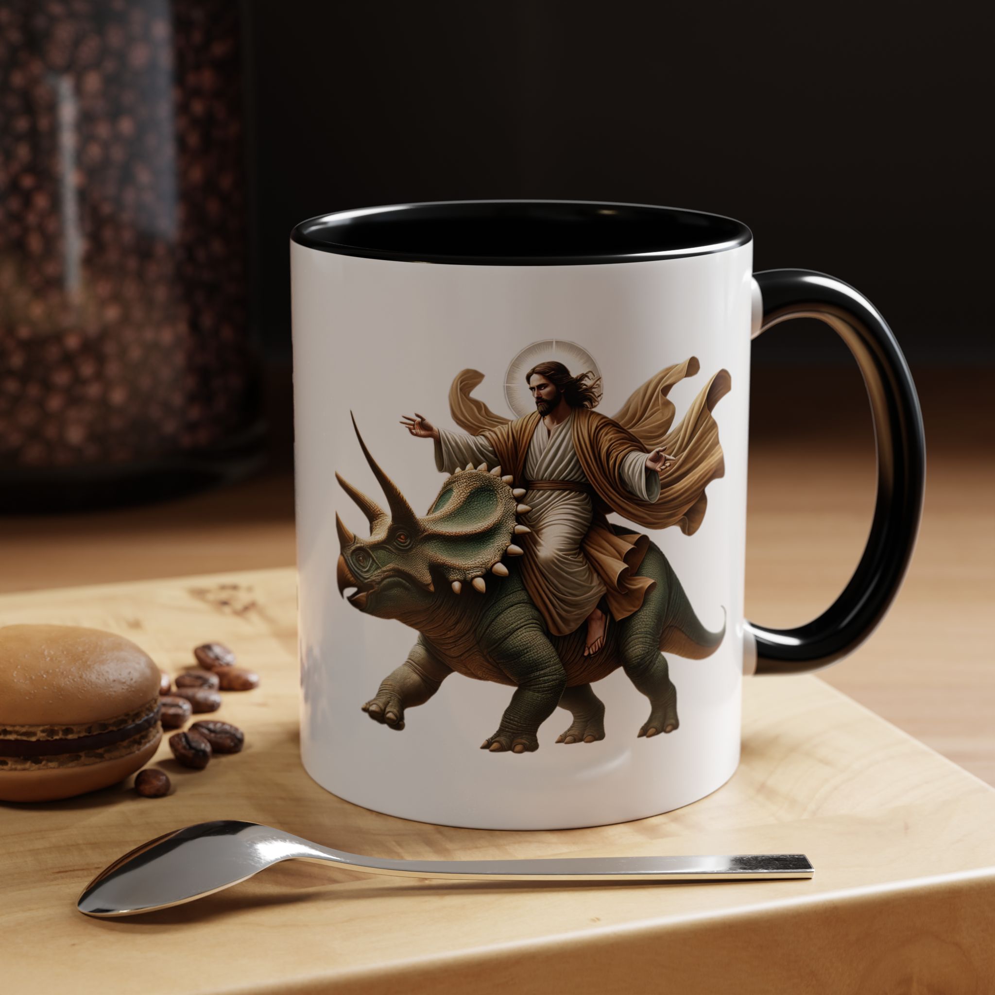 Soyez le premier à laisser votre avis sur “Funny Mug Jurassic gift coffee lover cup boho unique mug Jesus christ riding a triceratops office accessory dinosaure”