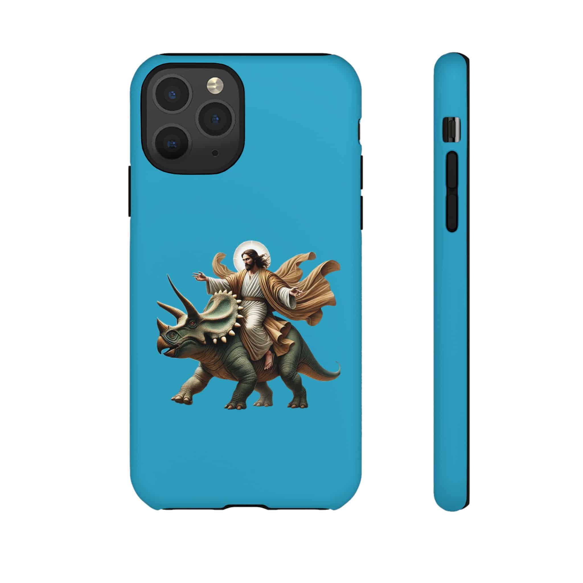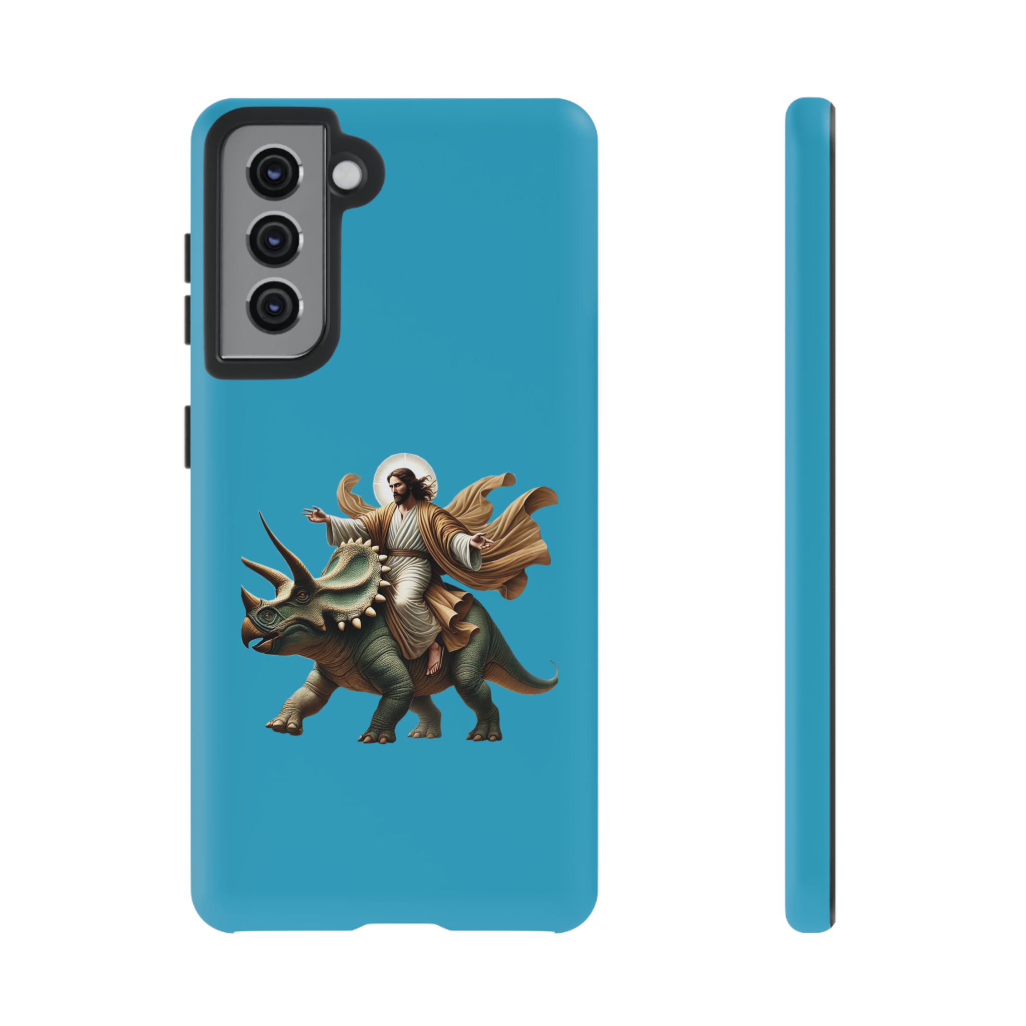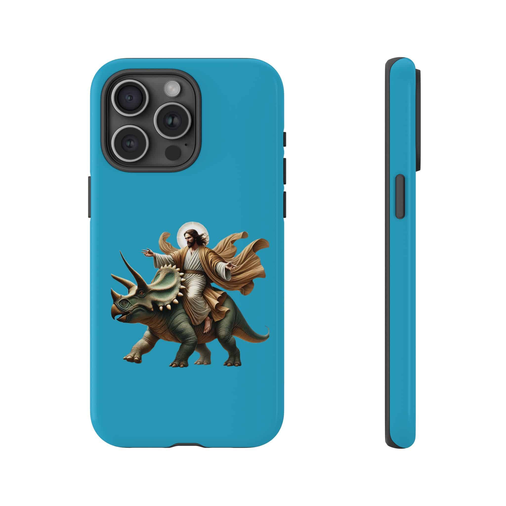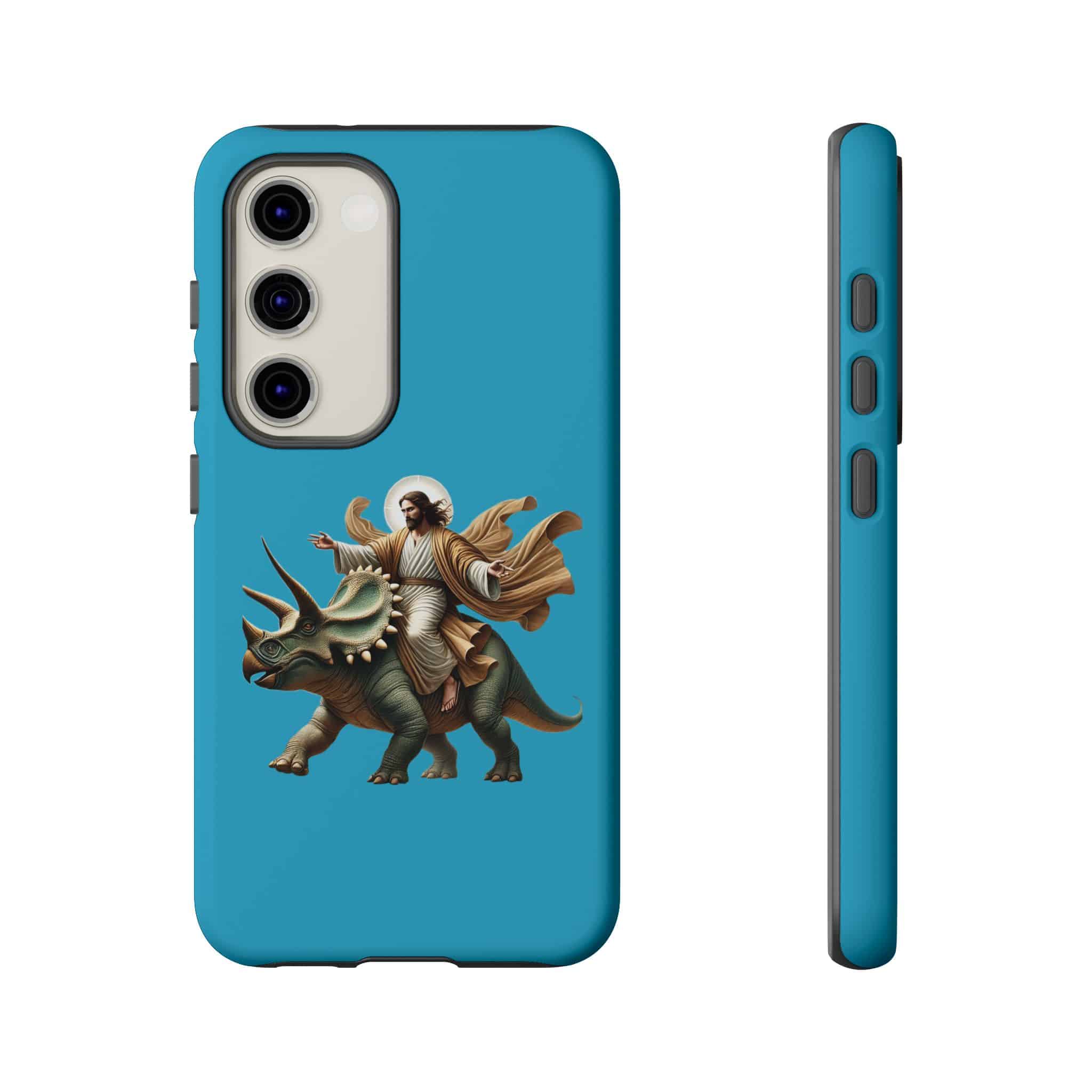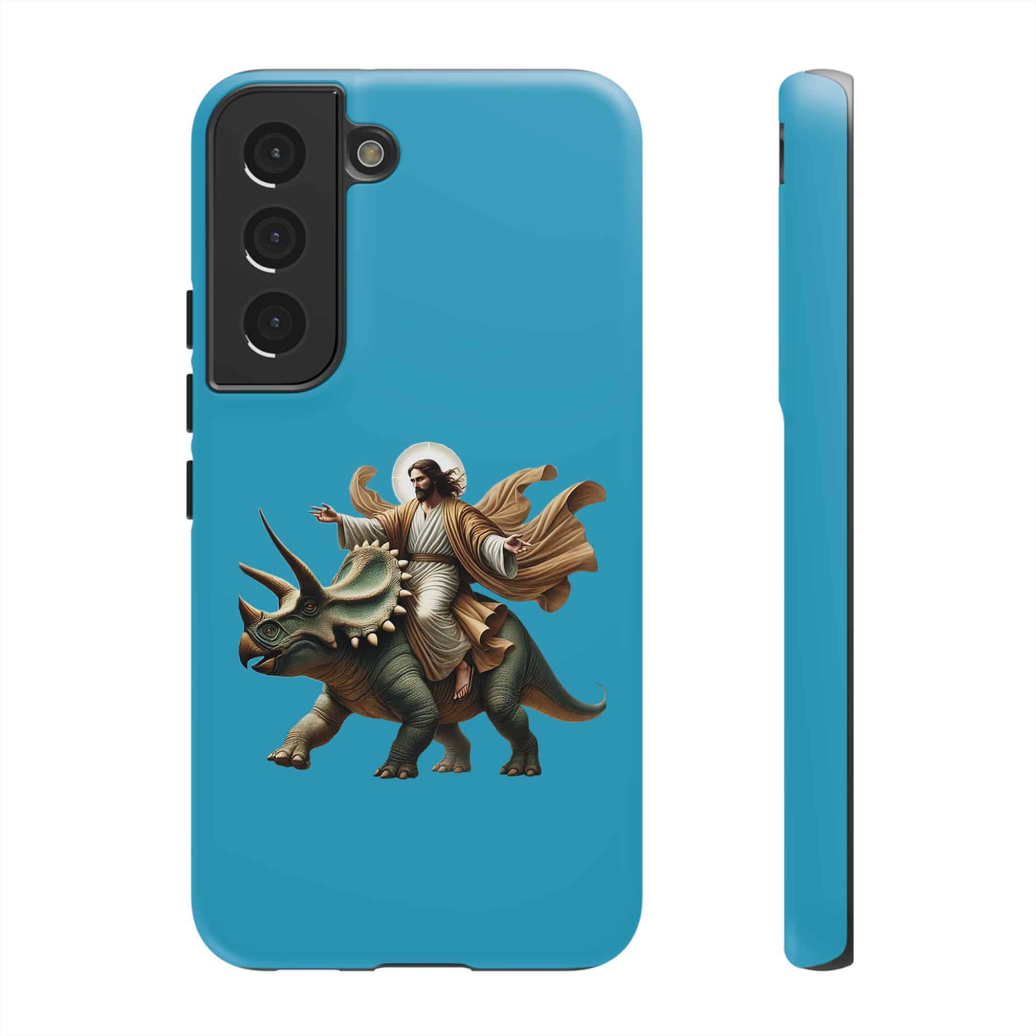 This ironic samsung case feels right at home with people who see funny jurassic phone and jesus on a dinosaur as part of their everyday universe.