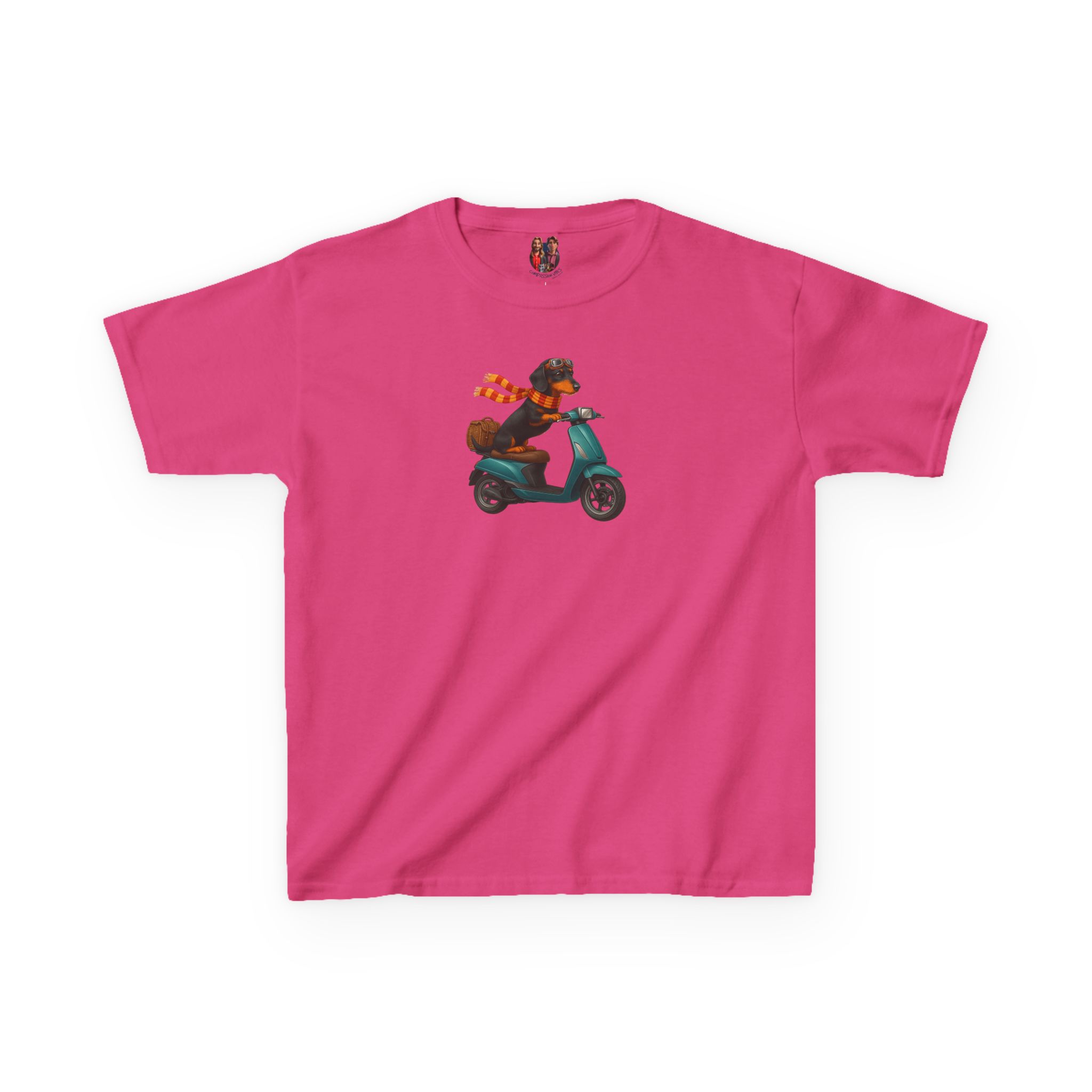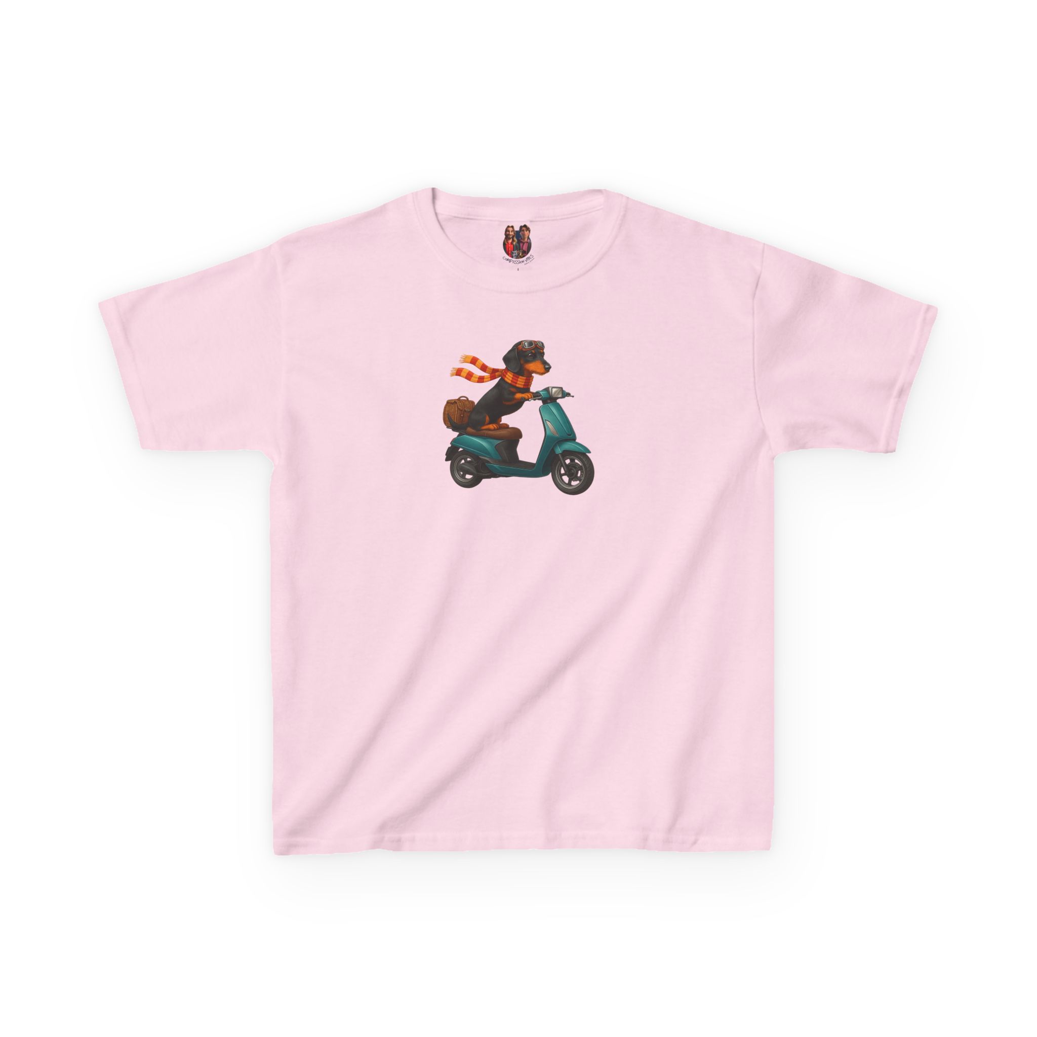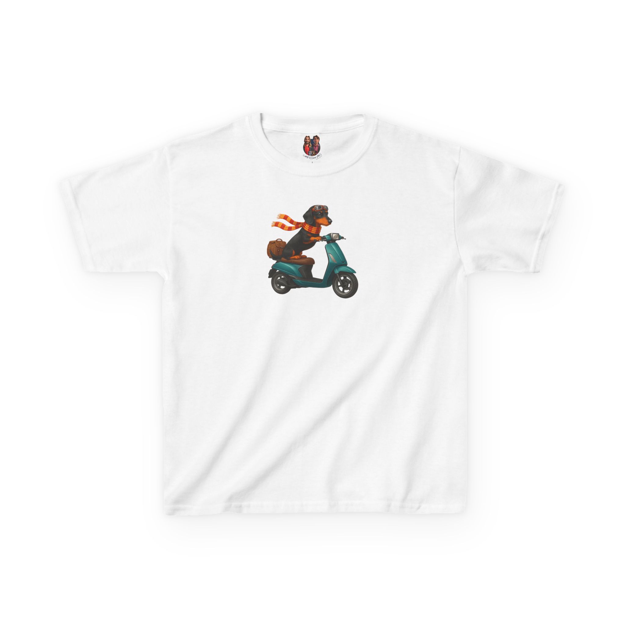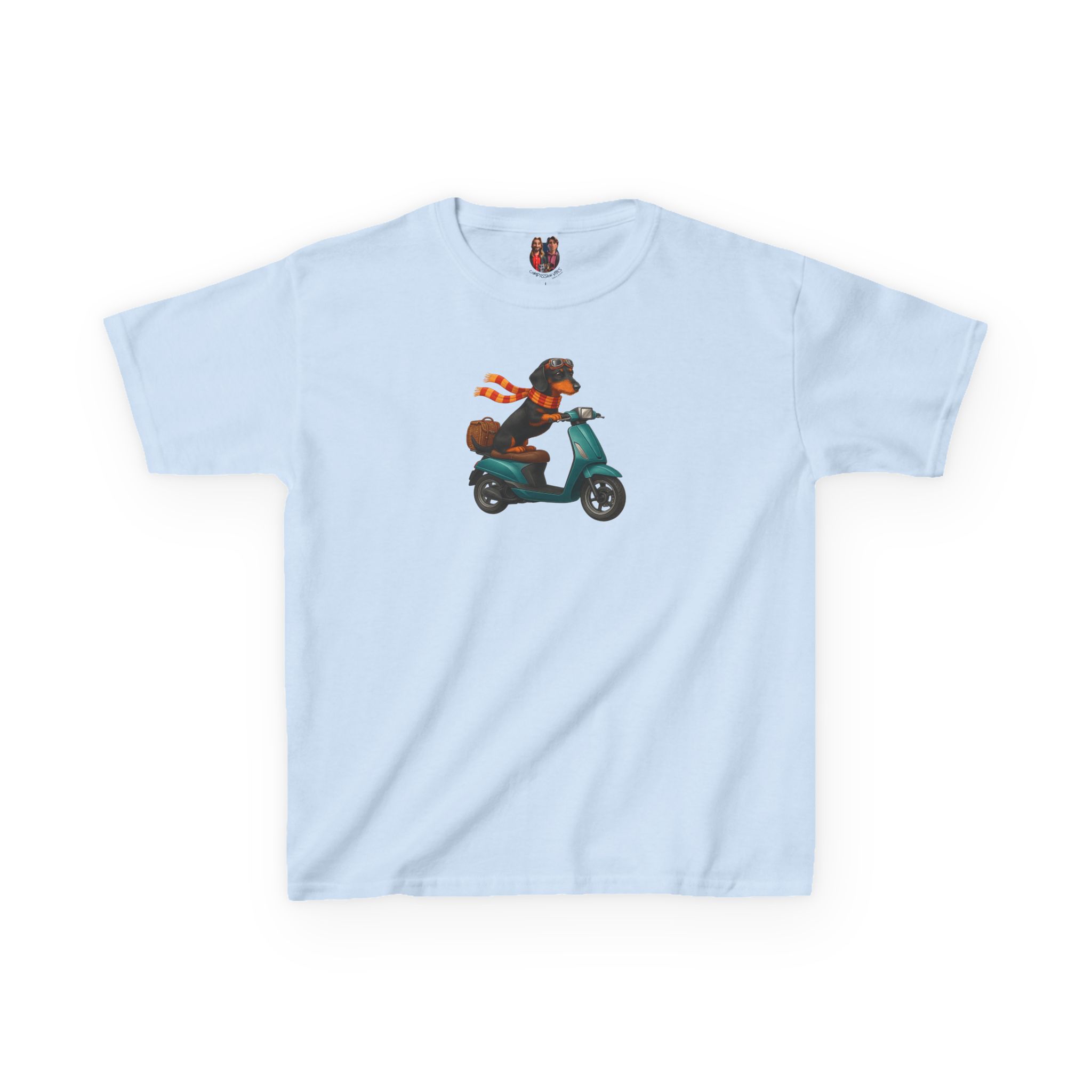 This funny dog kids tee, starring a fearless funny dachshund, races into fashion as a dog scooter kids tee.