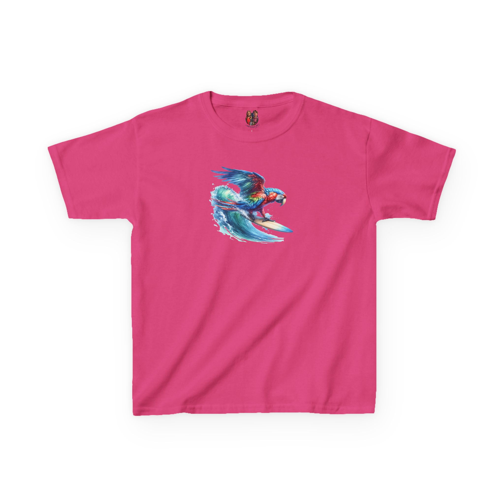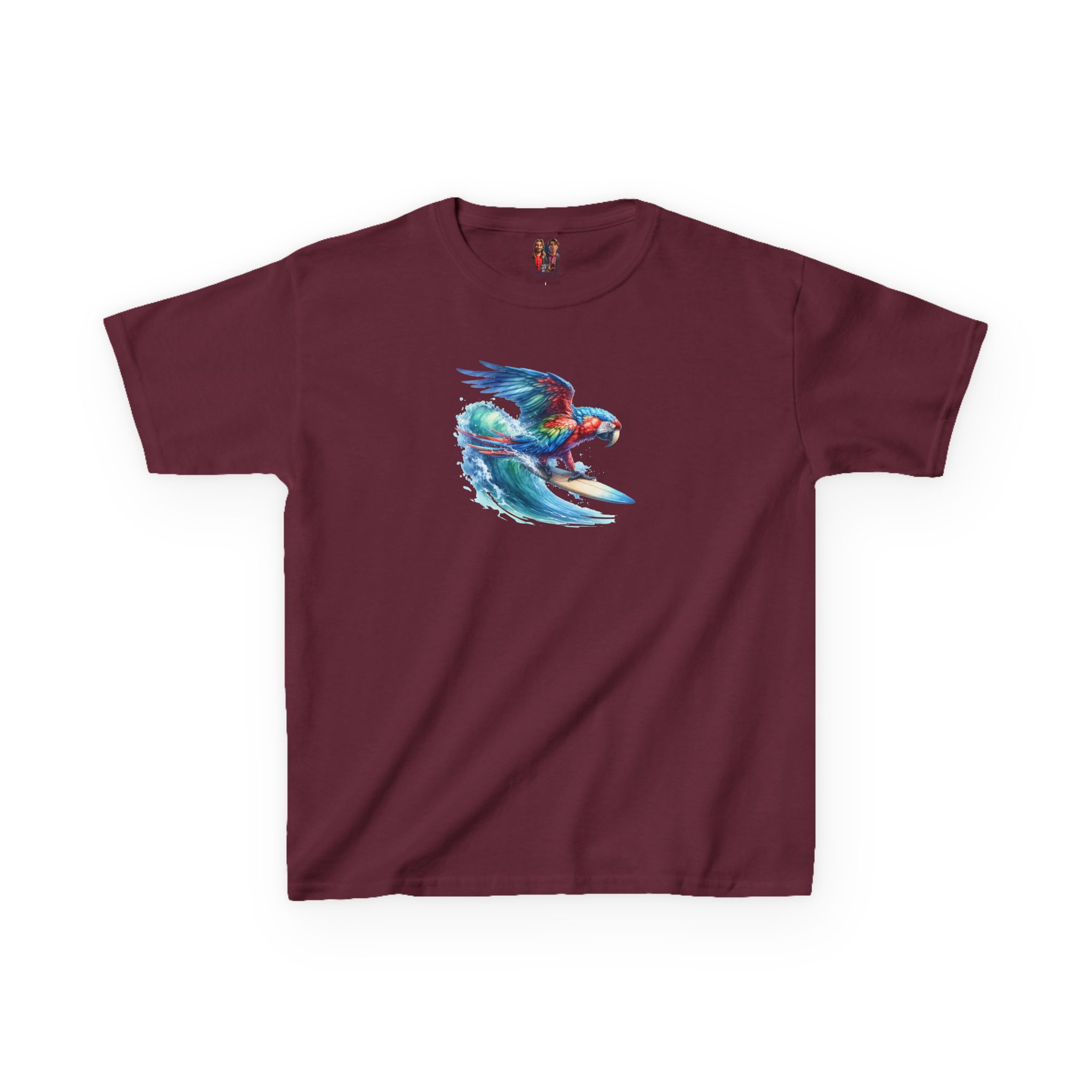 This funny surf child tshirt blends beach humor with bold parrot print design.