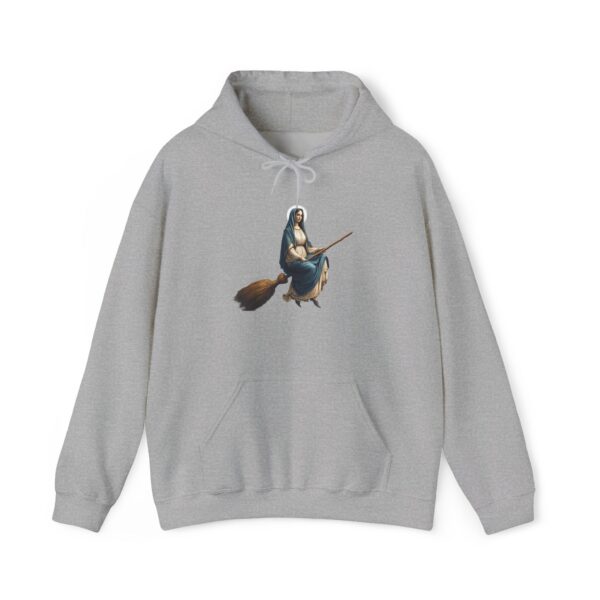 Satiric sweater Virgin Mary witch broom Funny Hoodie religious print sarcastic print premium apparel unusual clothes