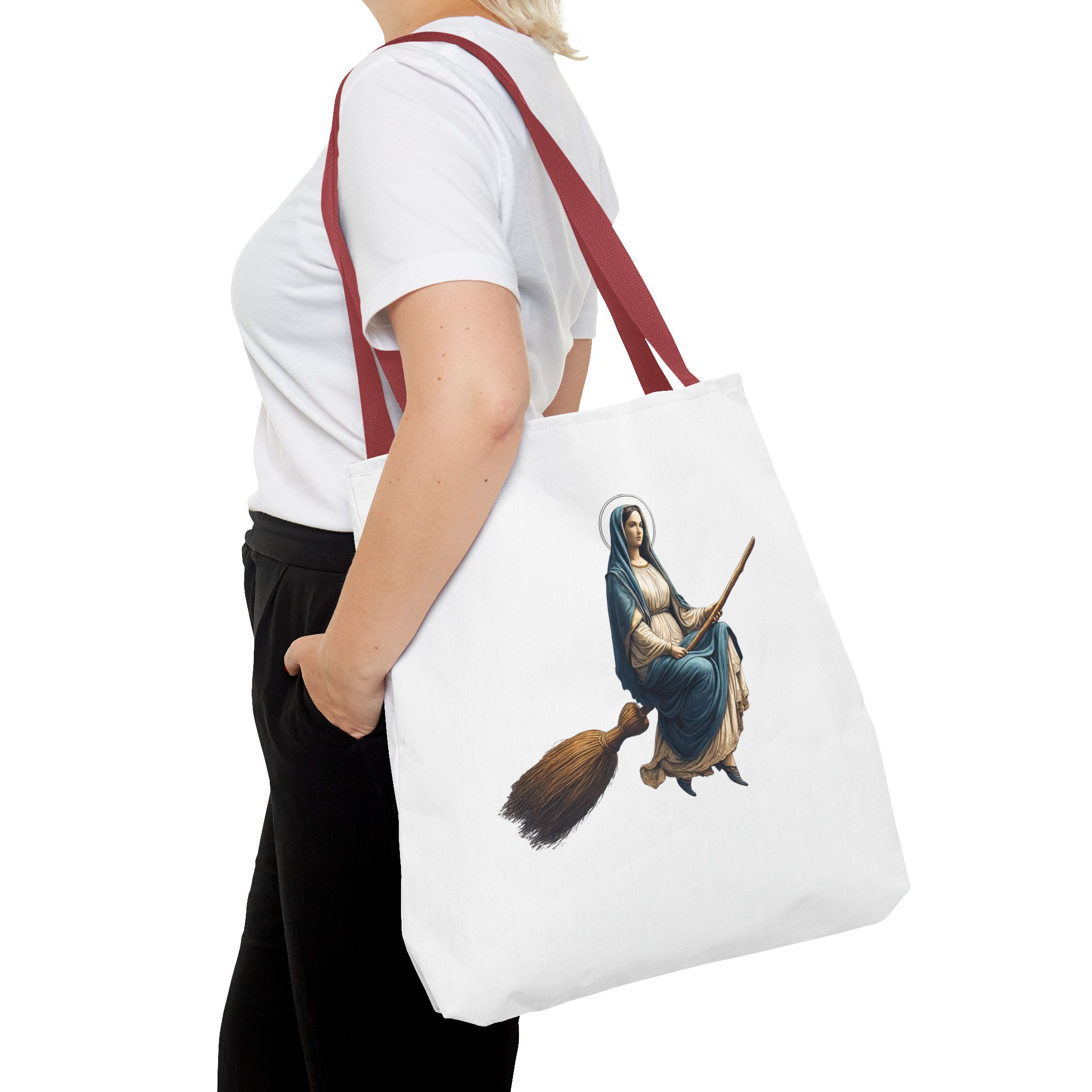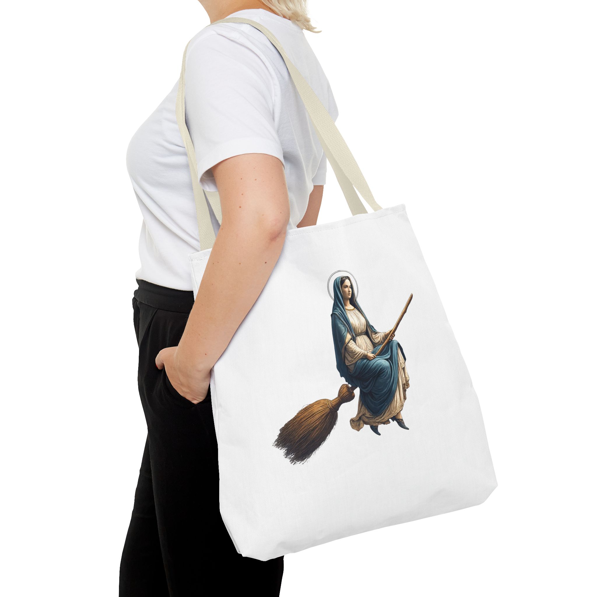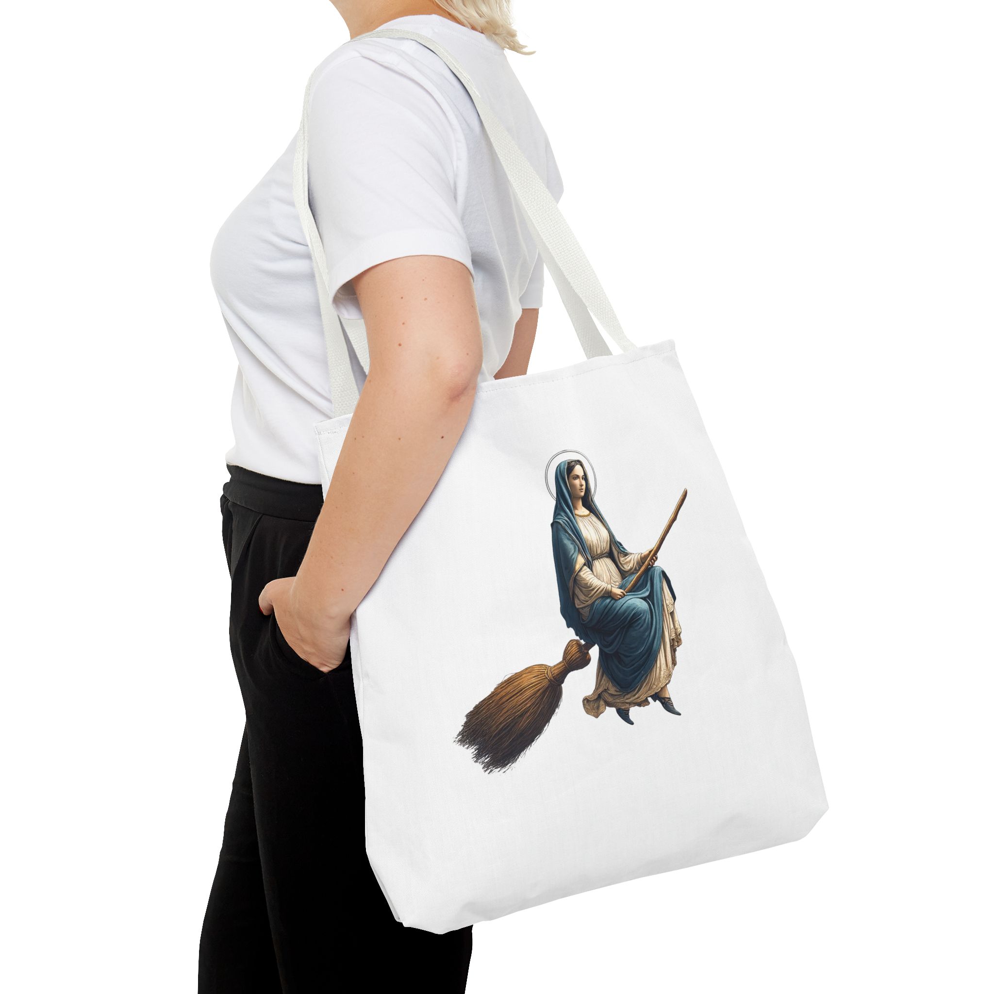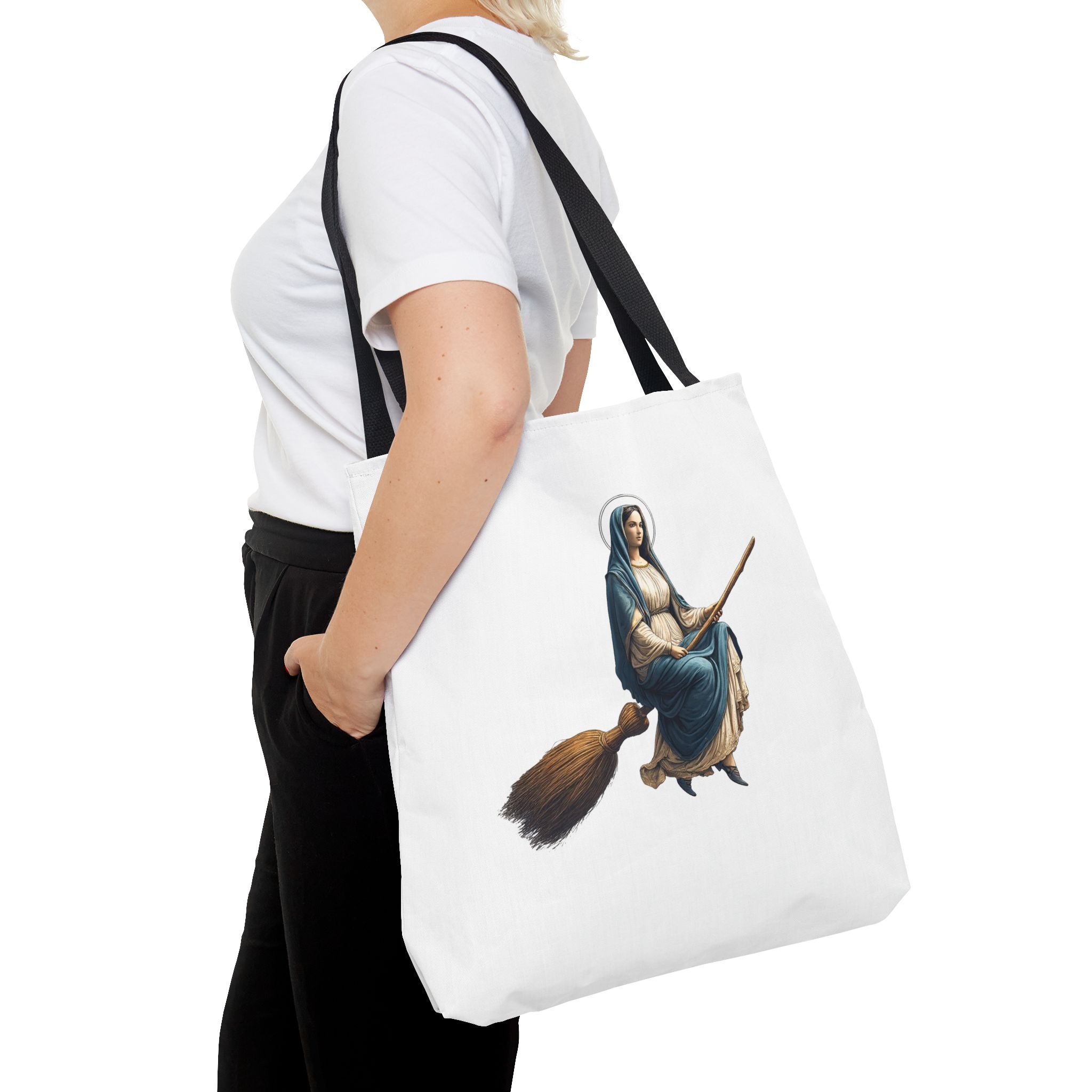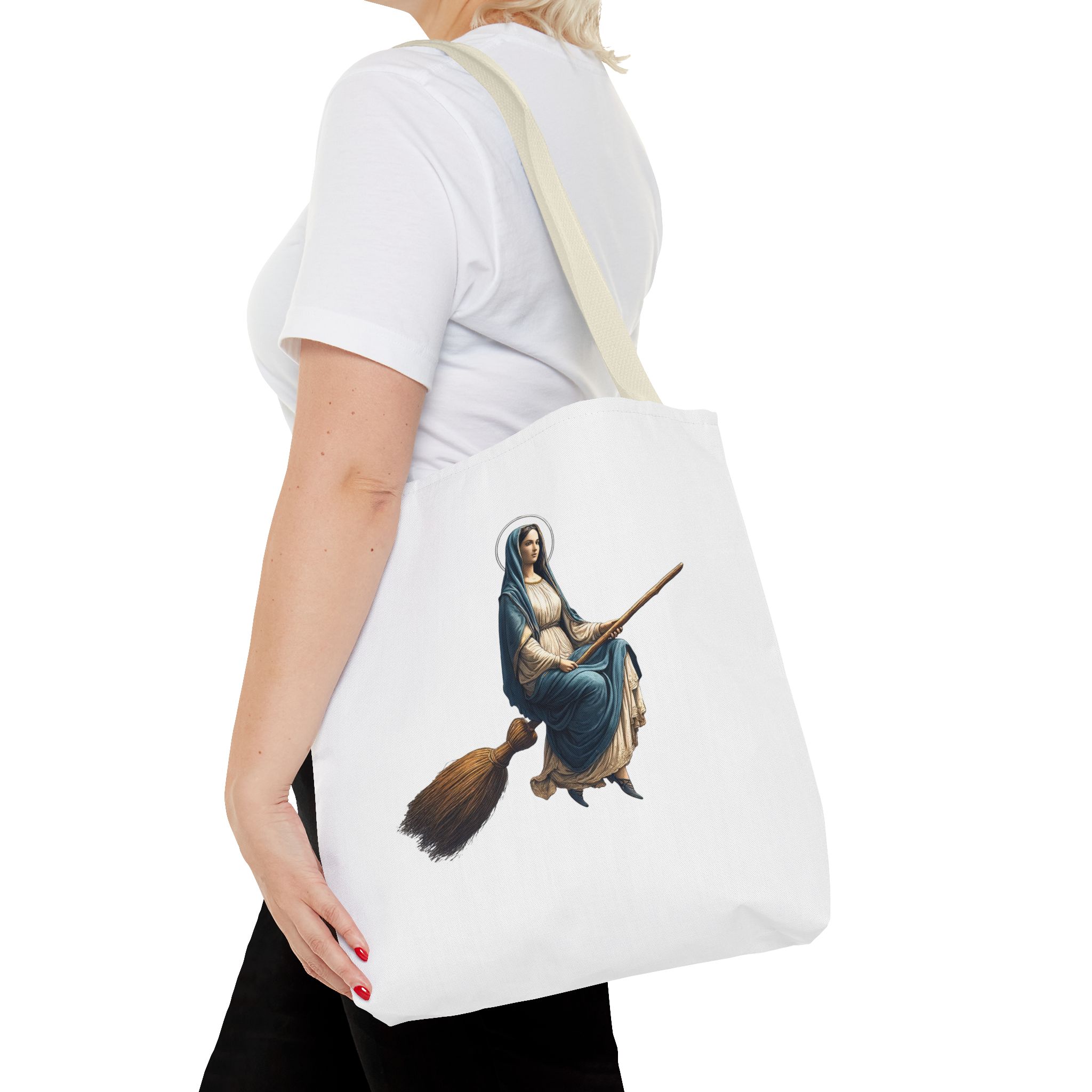 This tote virgin mary brings a modern, expressive touch to your everyday essentials while keeping a clean and balanced look.