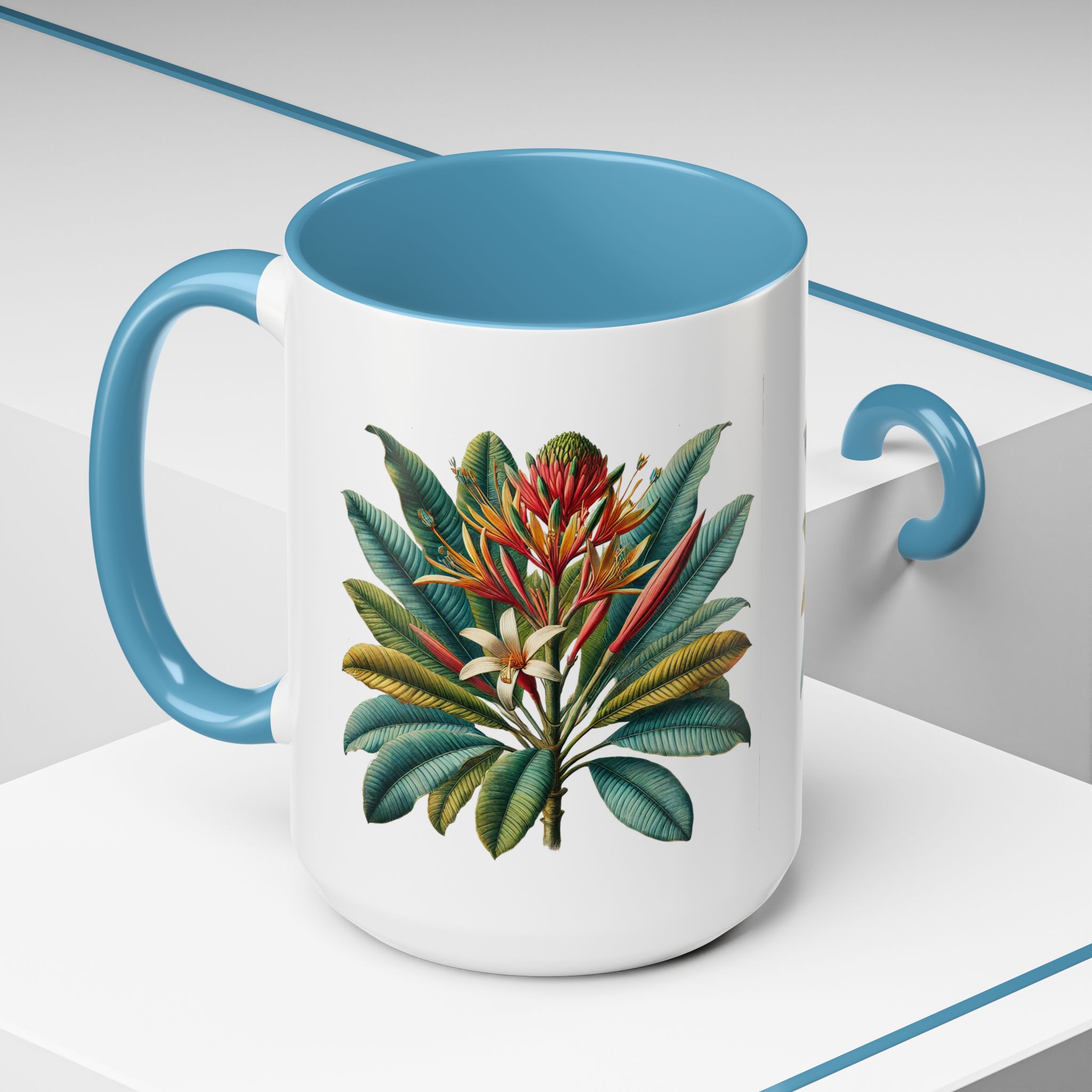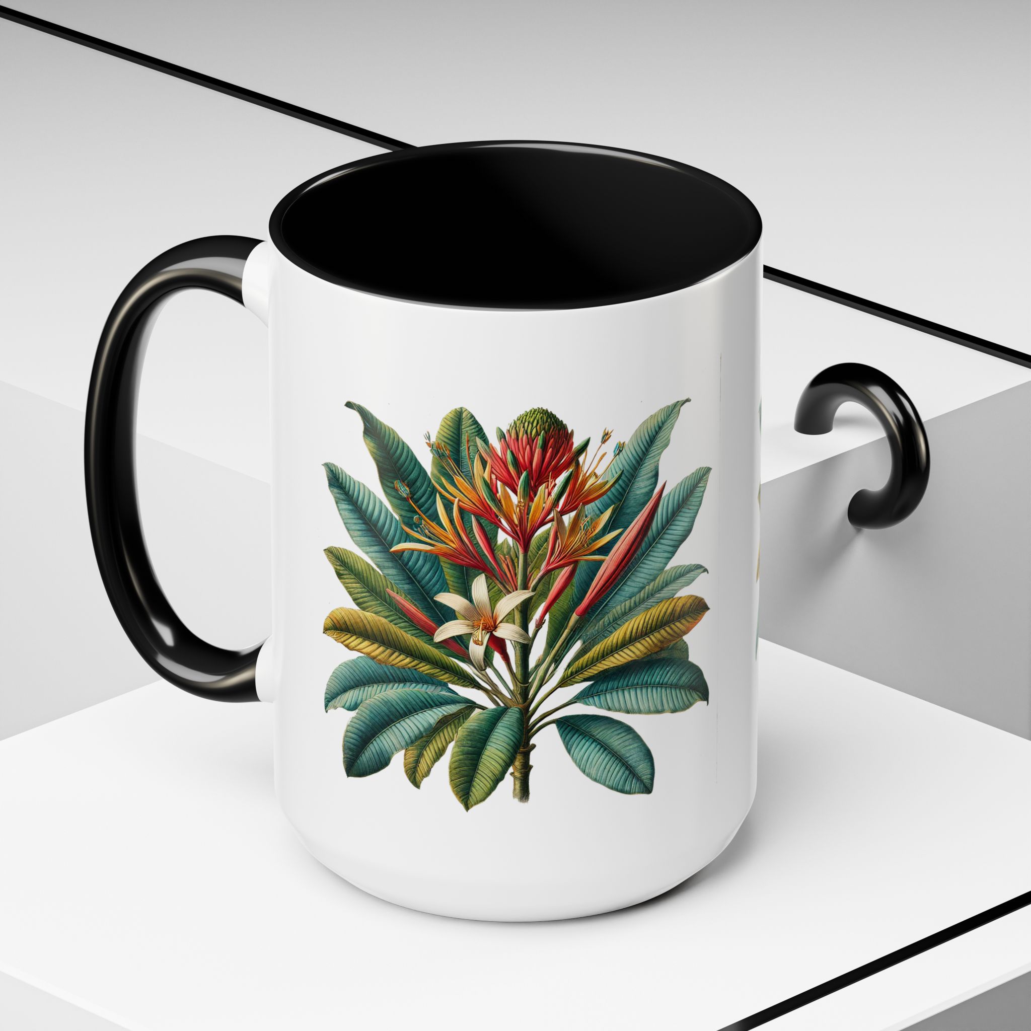 Each element of this tropical flower graphic mug has been considered to create a polished accessory rooted in subtle personality.